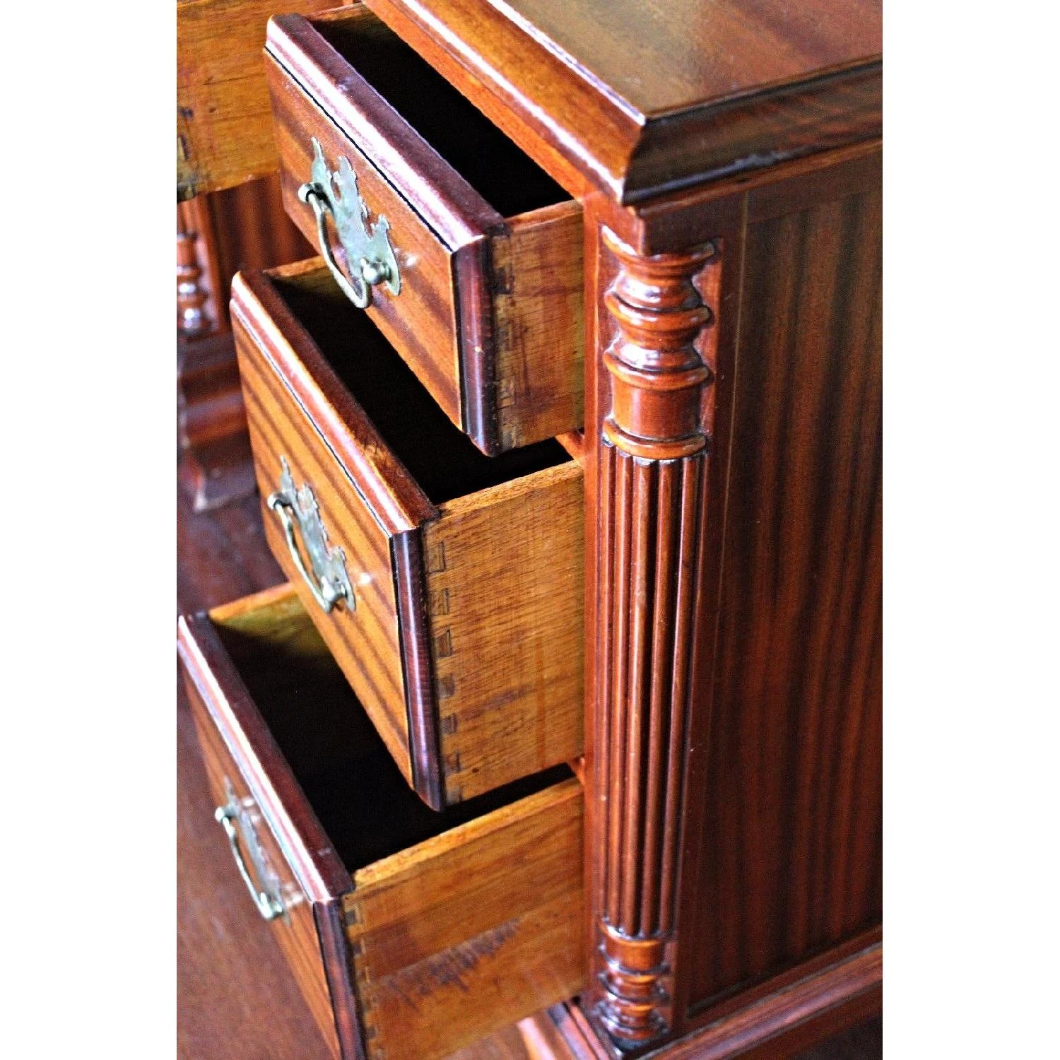 Seller’s Notes: On offer on this occasion is a sensational Chippendale style vanity table/desk. Featuring highly grained mahogany, fluted corner columns, ogee bracket feet. Circa 1950.