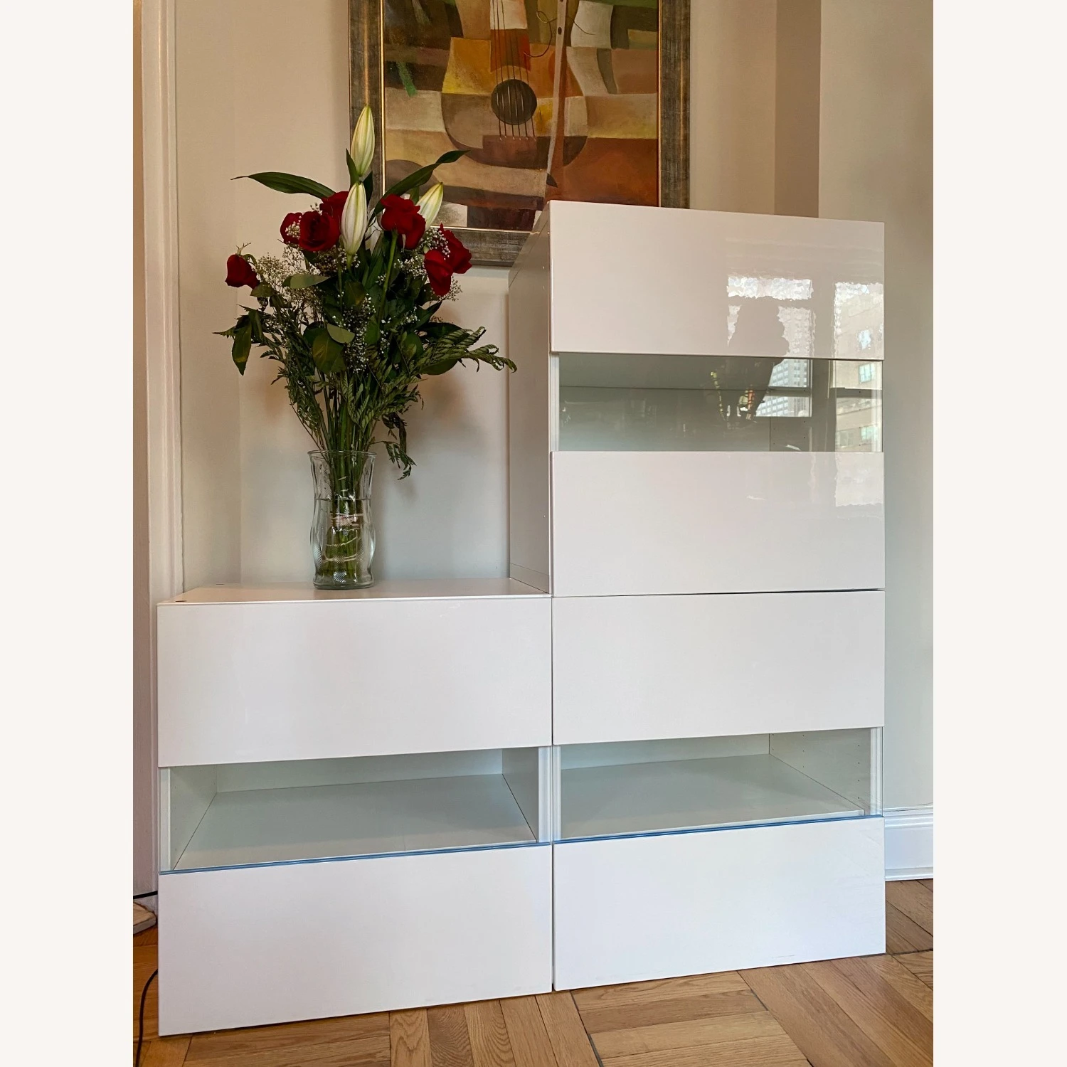 Doors are glass and shiny white solid finish. Each of the 3 squares has 1 glass shelf open for display, and 2 shelves closed for storage. Total 3 glass shelves, 6 closed shelves. _______________________________________