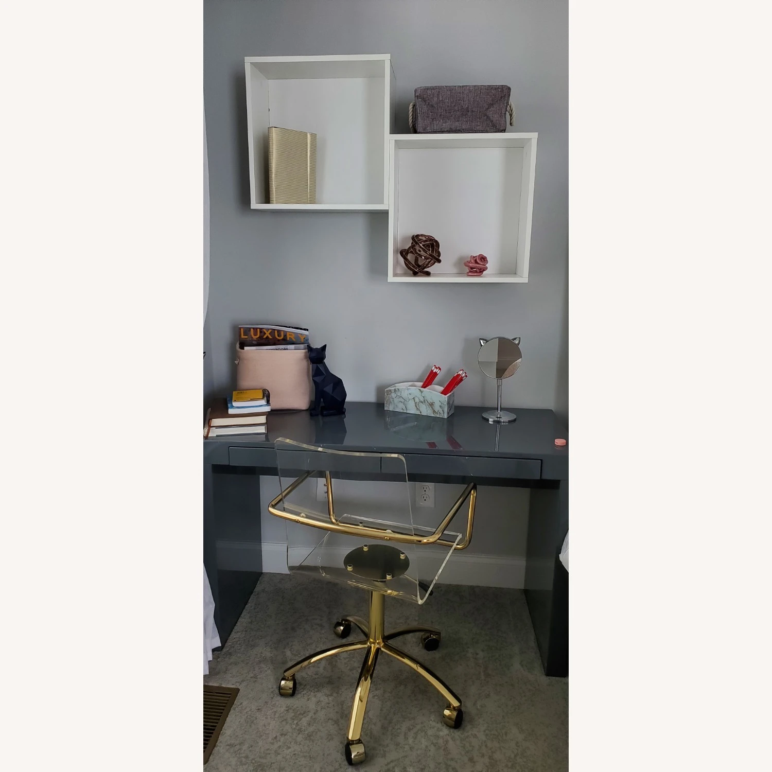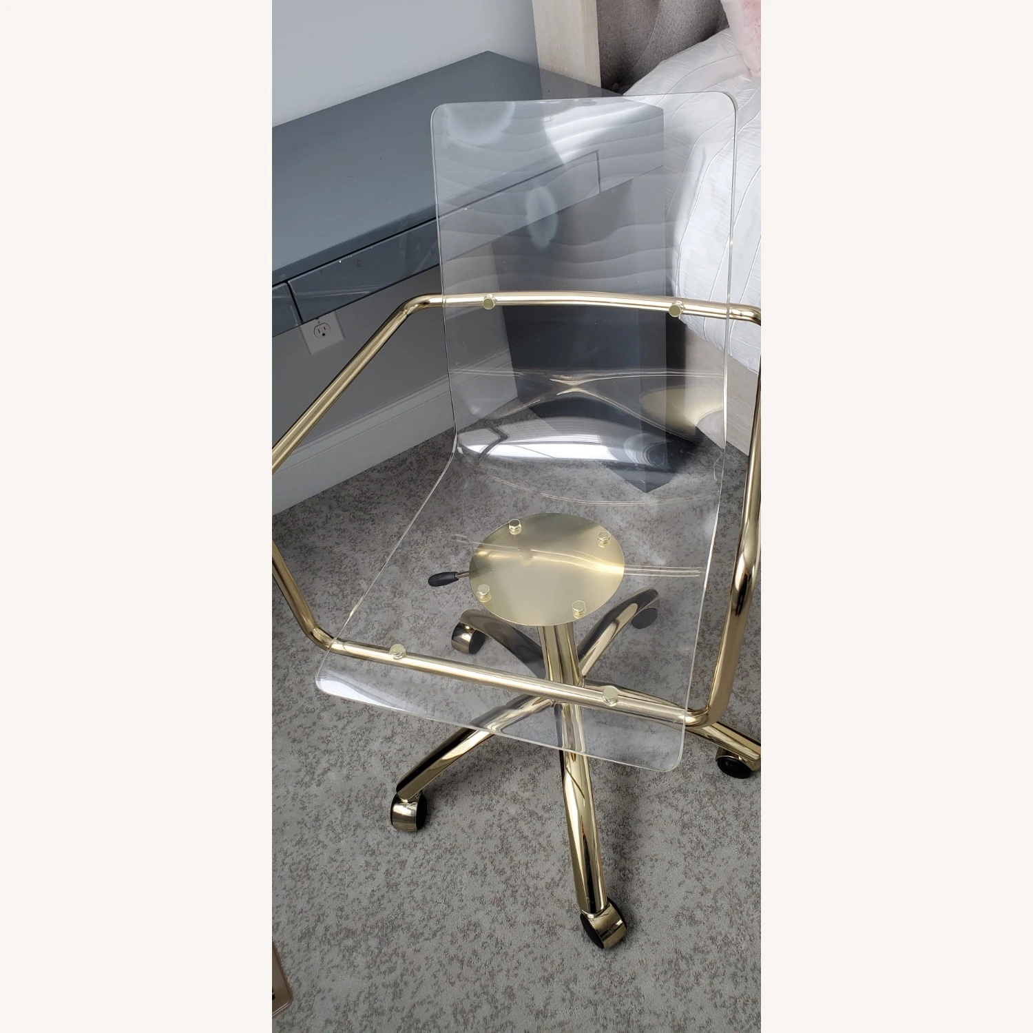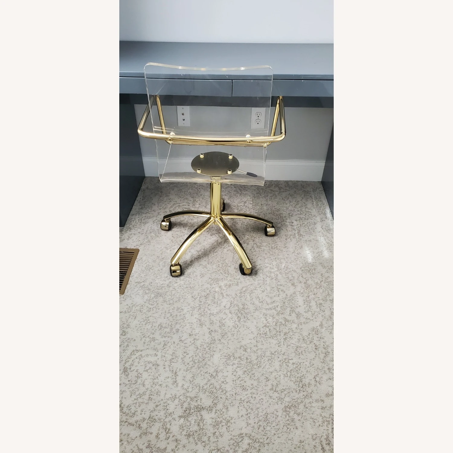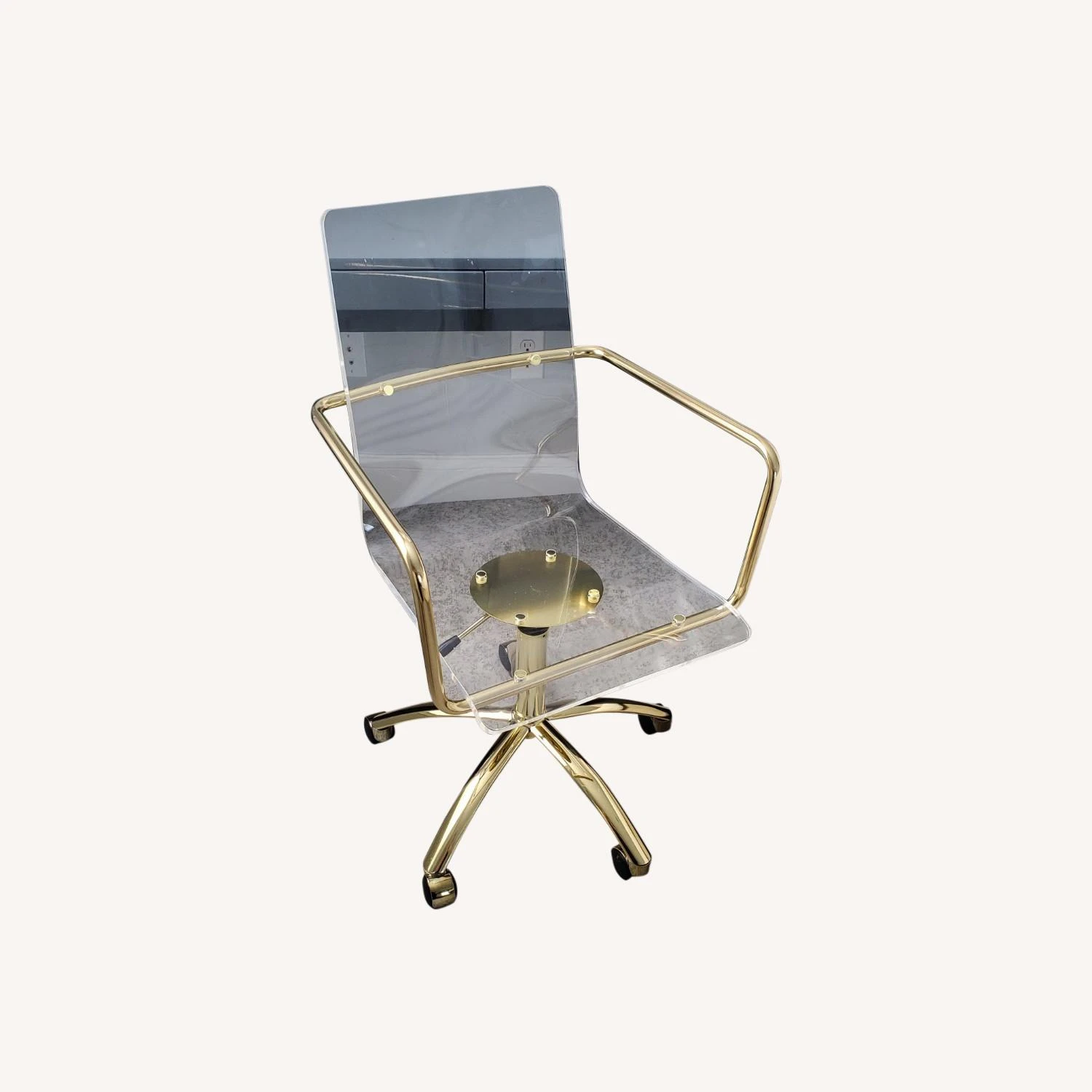 Seller’s Notes: Selling this modern style chair, which doesn’t take up lot of visual space. The one-piece body has an ergonomic design, providing comfort and support in your home office. NEW – chair was displayed in a model home as décor. I bought the model home and am selling this chair to accommodate my own furniture. This hard-to-find gold steel frame has a swivel option and is height adjustable. Double wheel casters on the five feet for ease of movement. Great for smaller spaces. Seat height is adjustable between 17.5 inches – 22.5 inches tall.