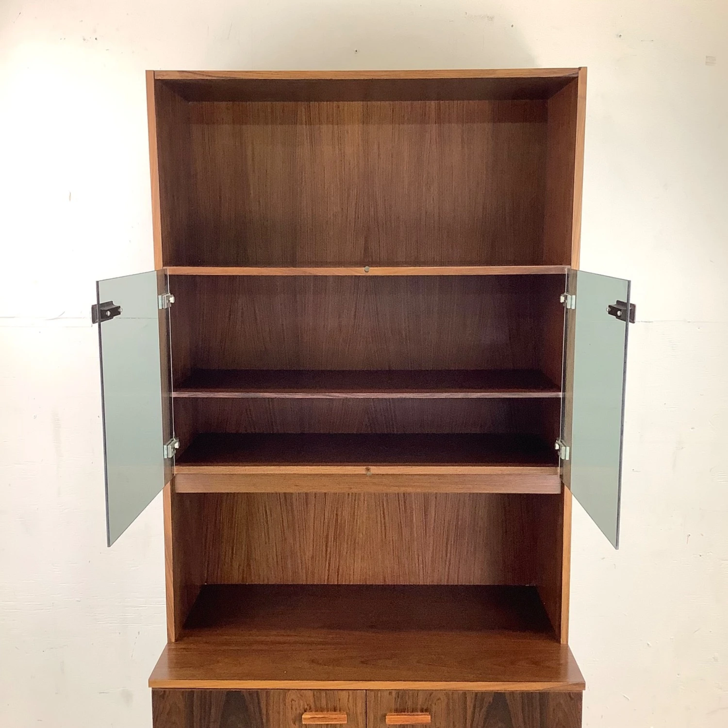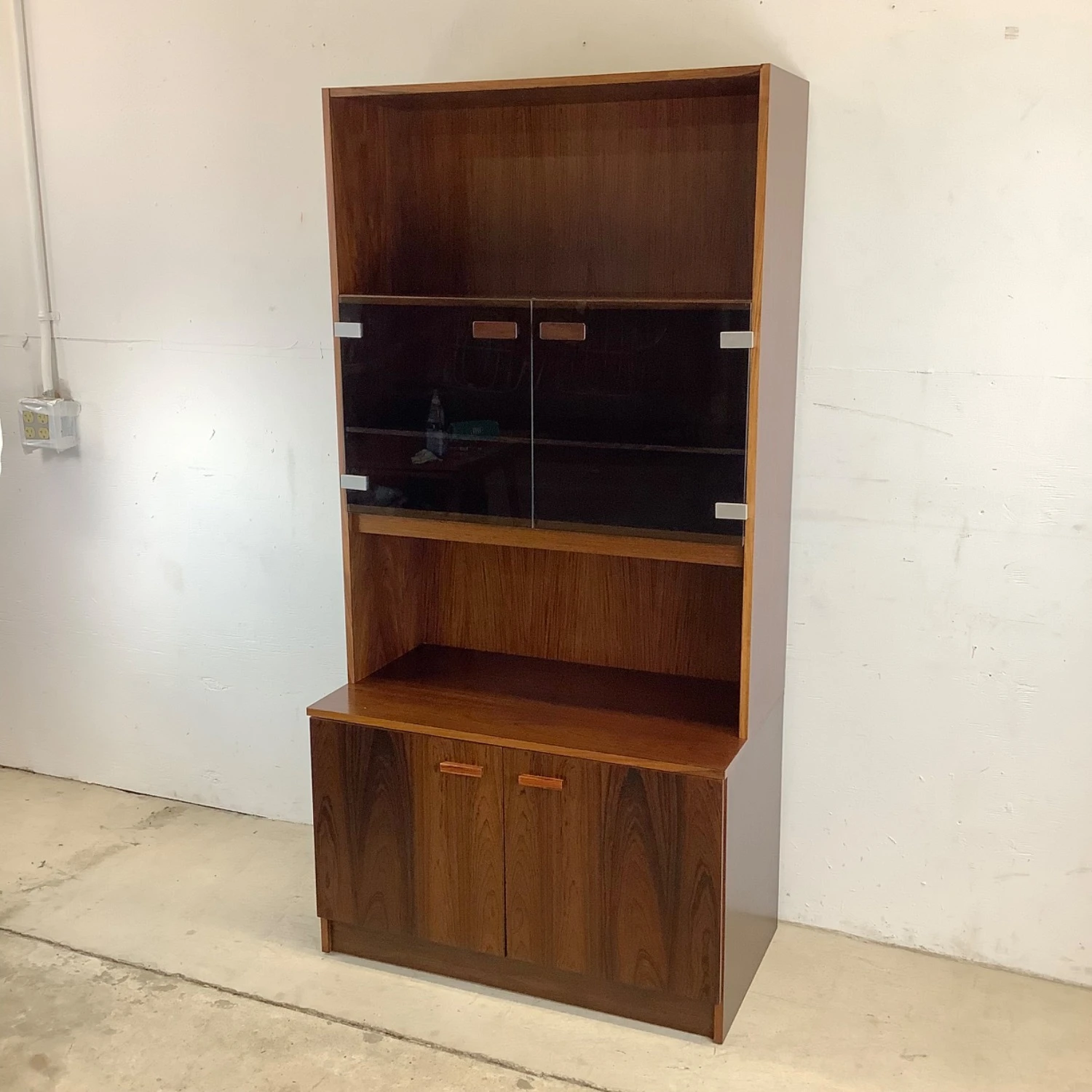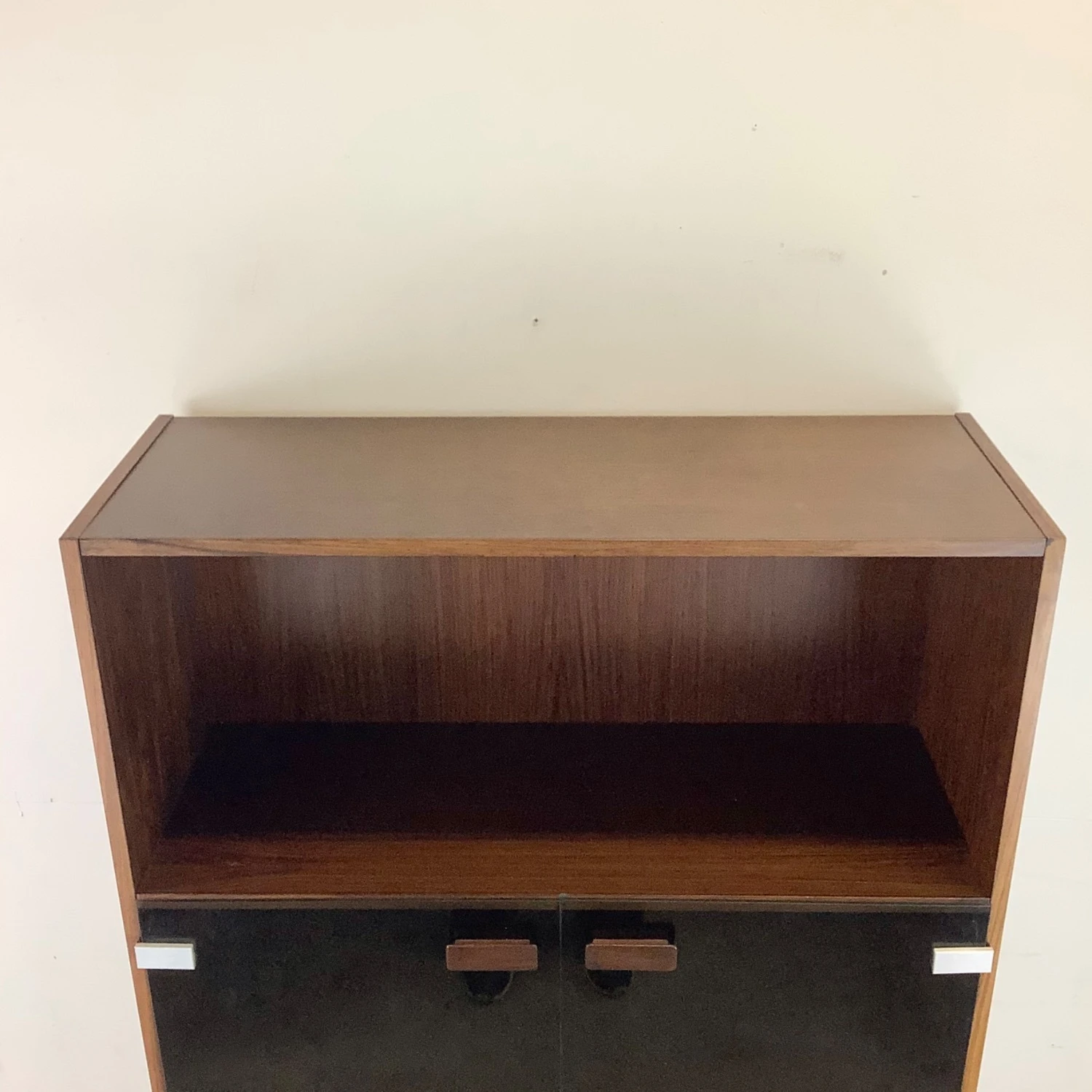 Seller’s Notes: This stylish Scandinavian modern rosewood bookshelf with smoked glass cabinet and lower storage cupboard makes a unique addition to any interior. The perfect size for a space saving bar cabinet or for a mixture of display and storage in home or office setting.