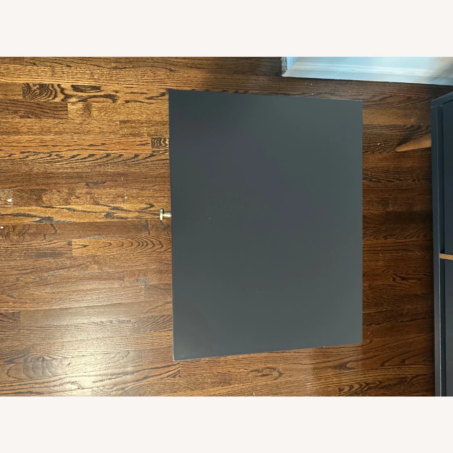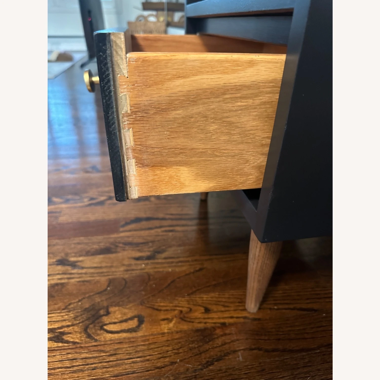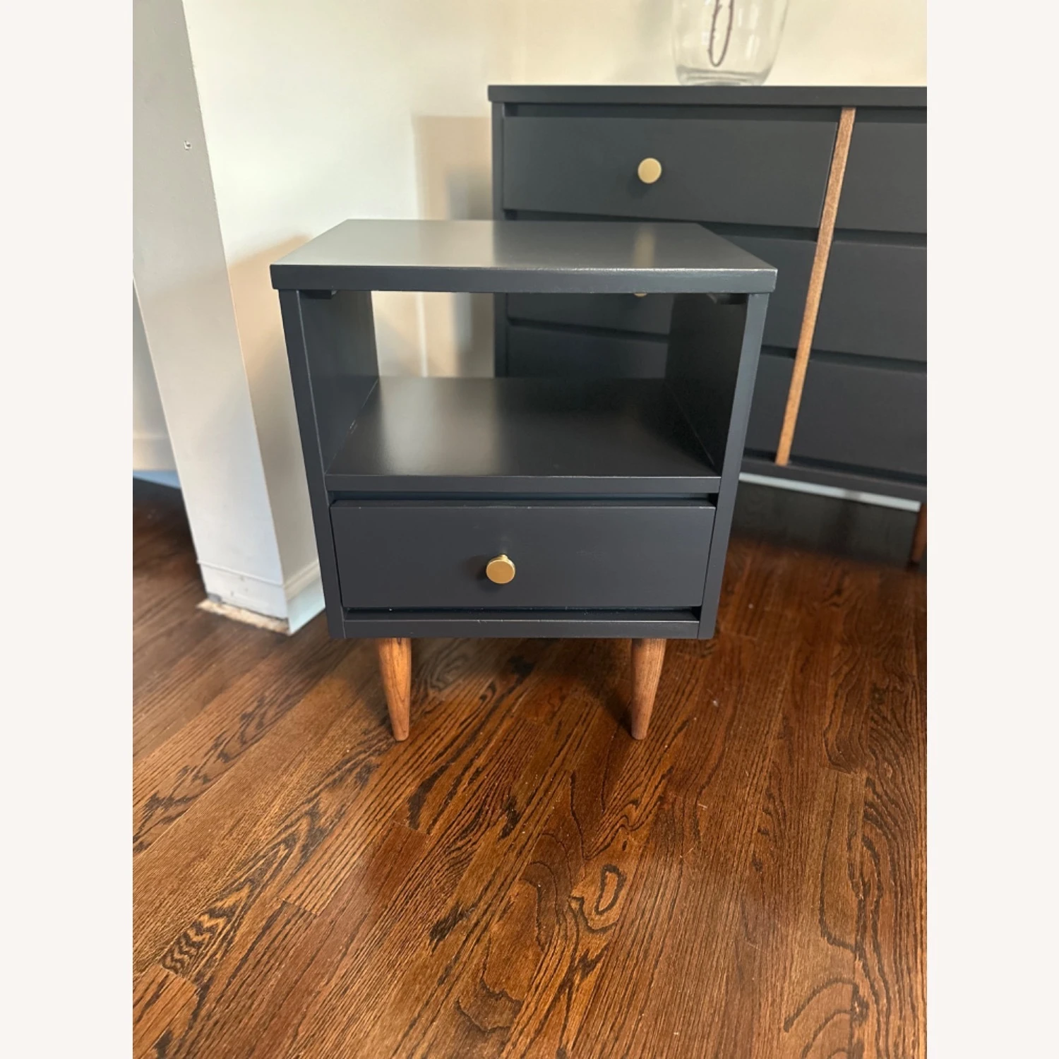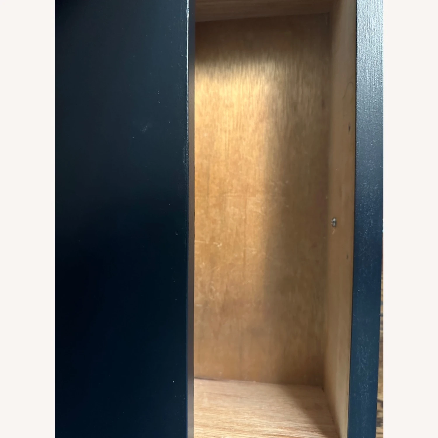 Seller’s Notes: Vintage 1960s Bassett single nightstand refinished in beautiful deep navy blue by Wise Owl One hour enamel paint “. It features dovetail joint, gold round hardware, tapered legs was stained “Early American,” and sealed. Also, there’s a matching 9 drawers dresser available in my other listing.