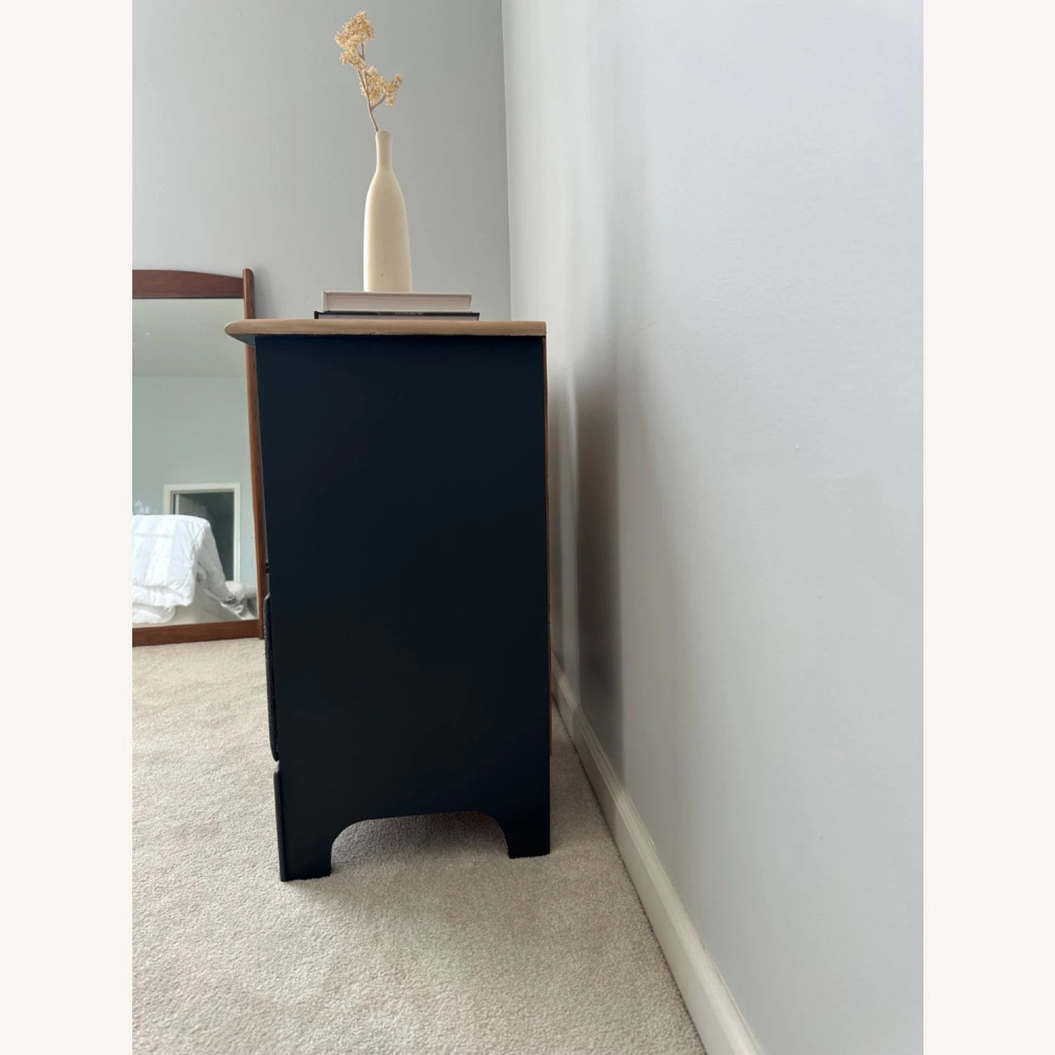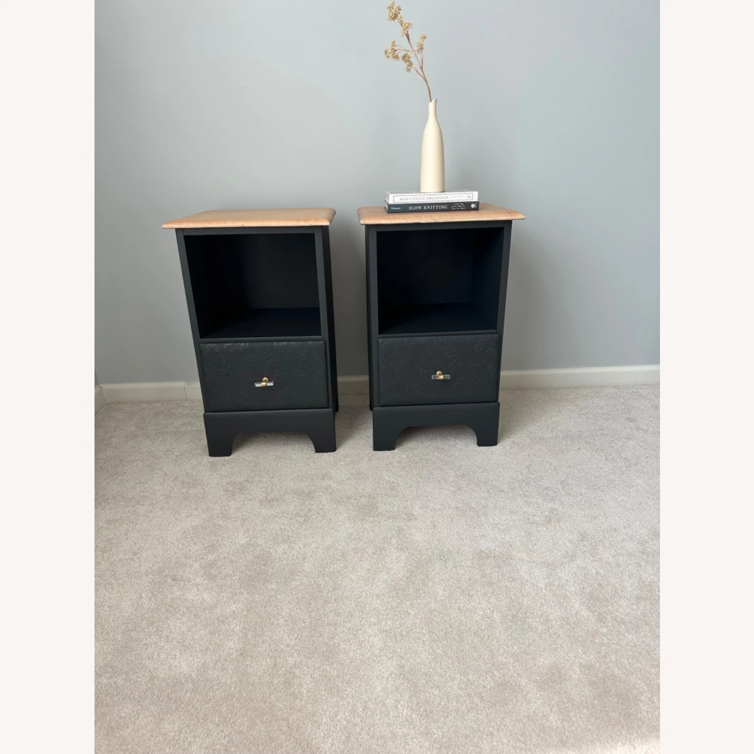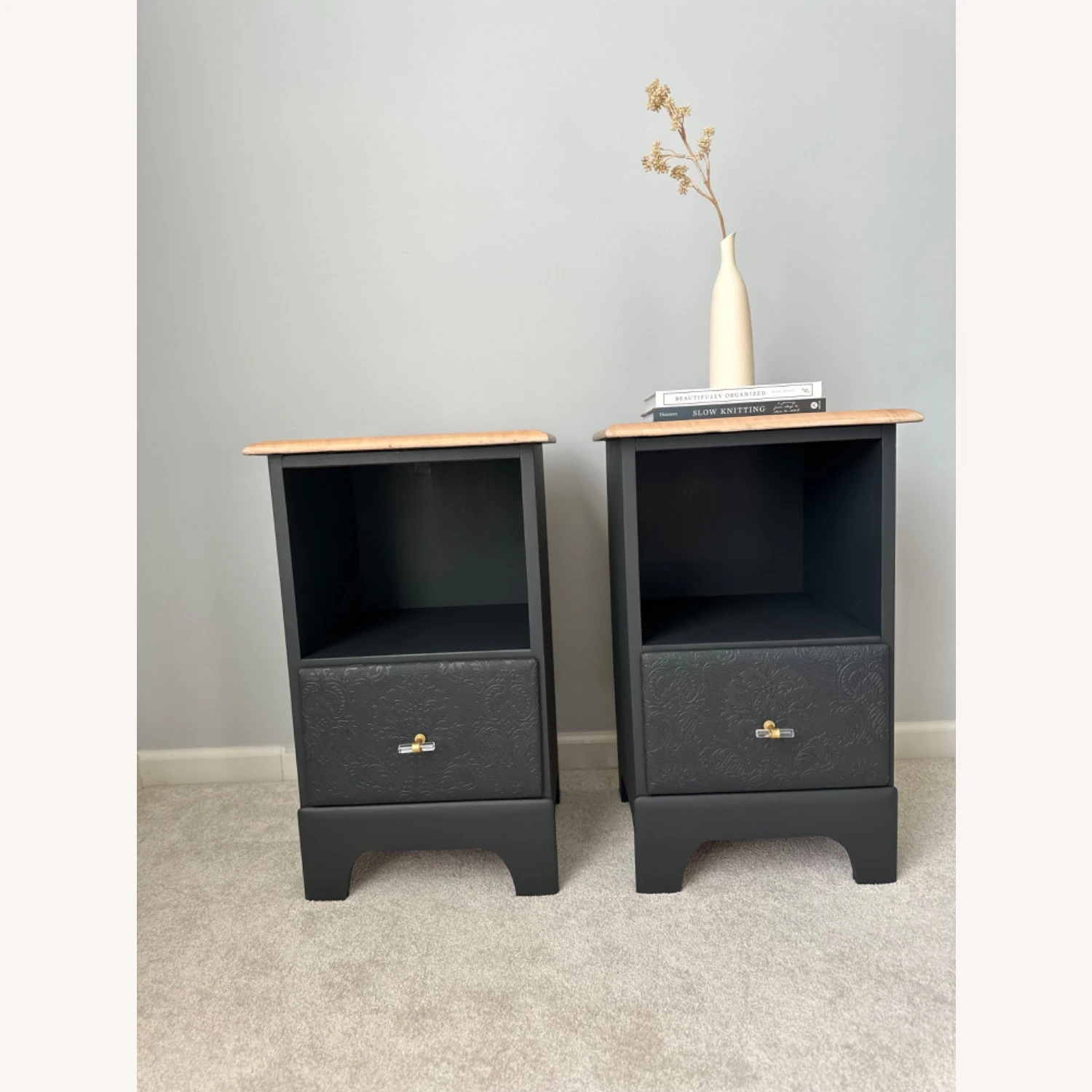 Seller’s Notes: This Solid Maple Nathan Hale Nightstands were refinished using fusion Mineral paint in the color “Ash,”is a soft yet bold charcoal grey. The top was sand down to bare wood and Tan wash was apply and sealed using Minwax poly in matte finish. I added paintable wallpaper to the front drawer for additional detail which elevates the piece.