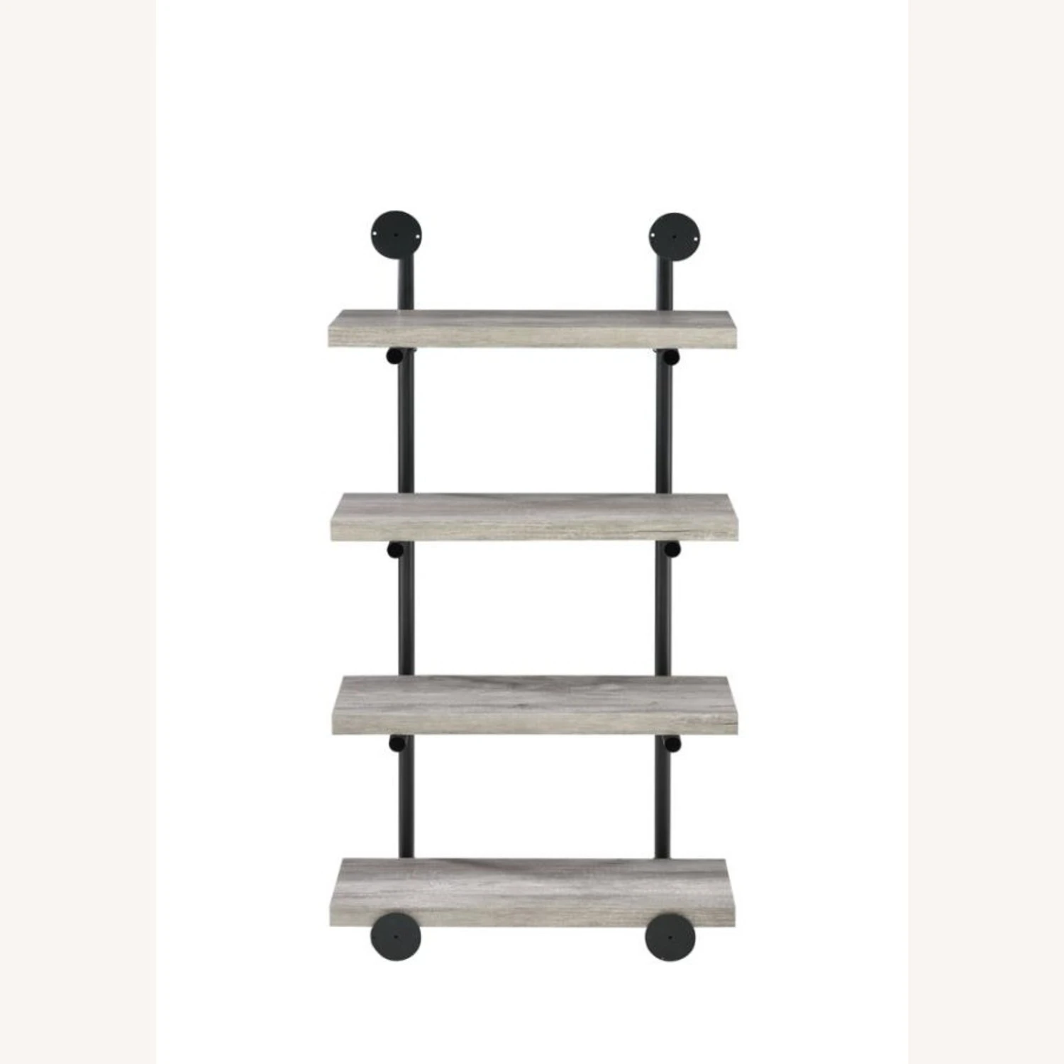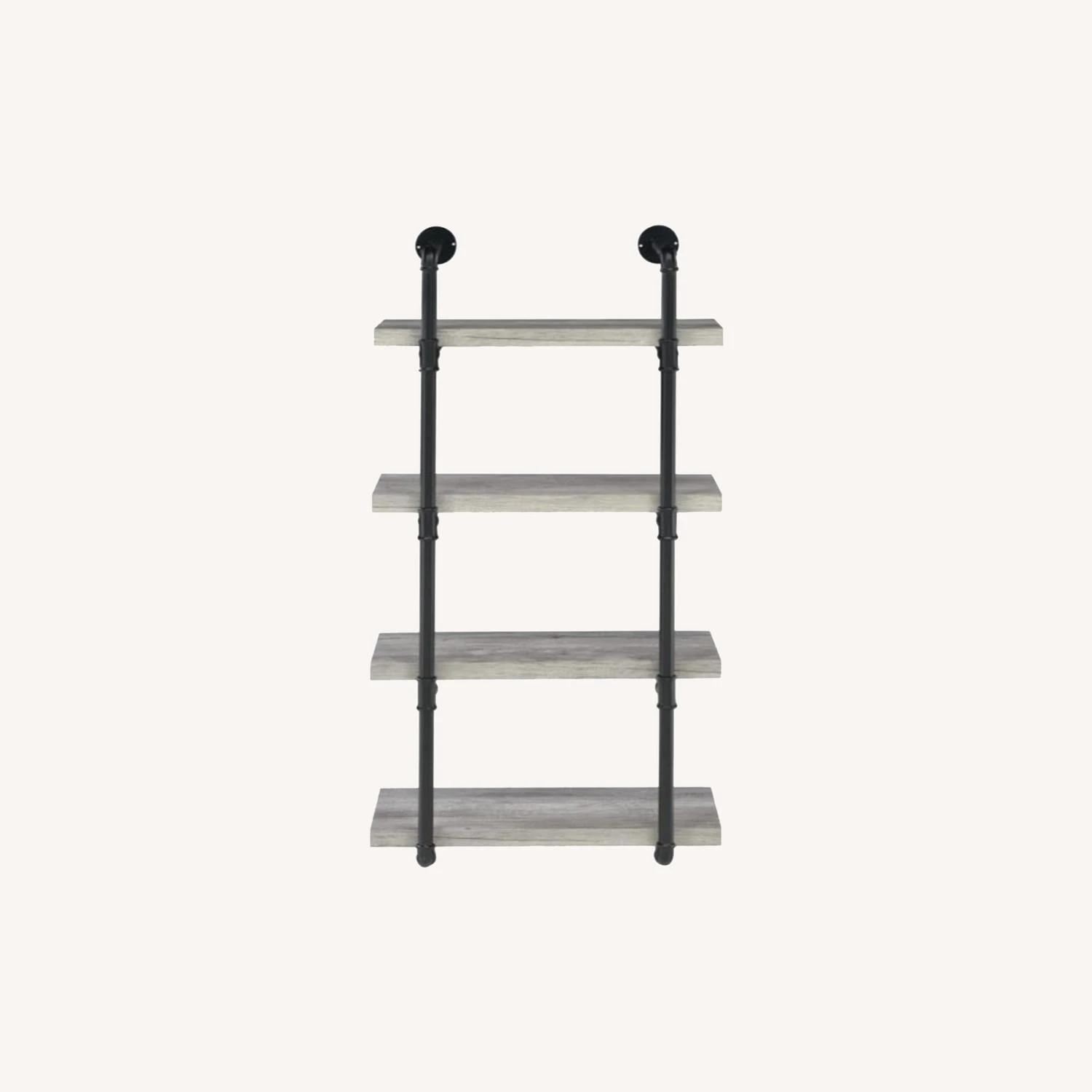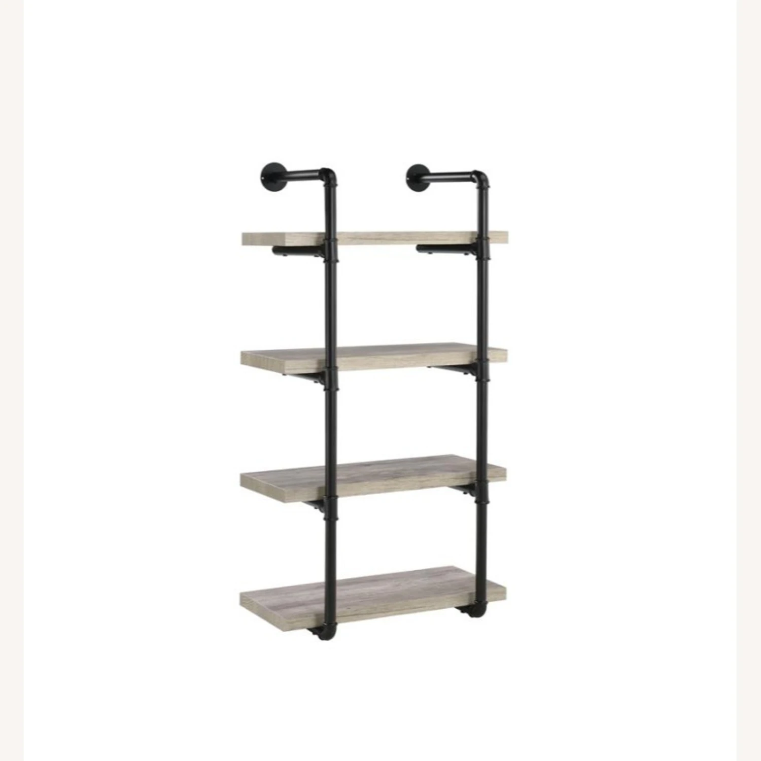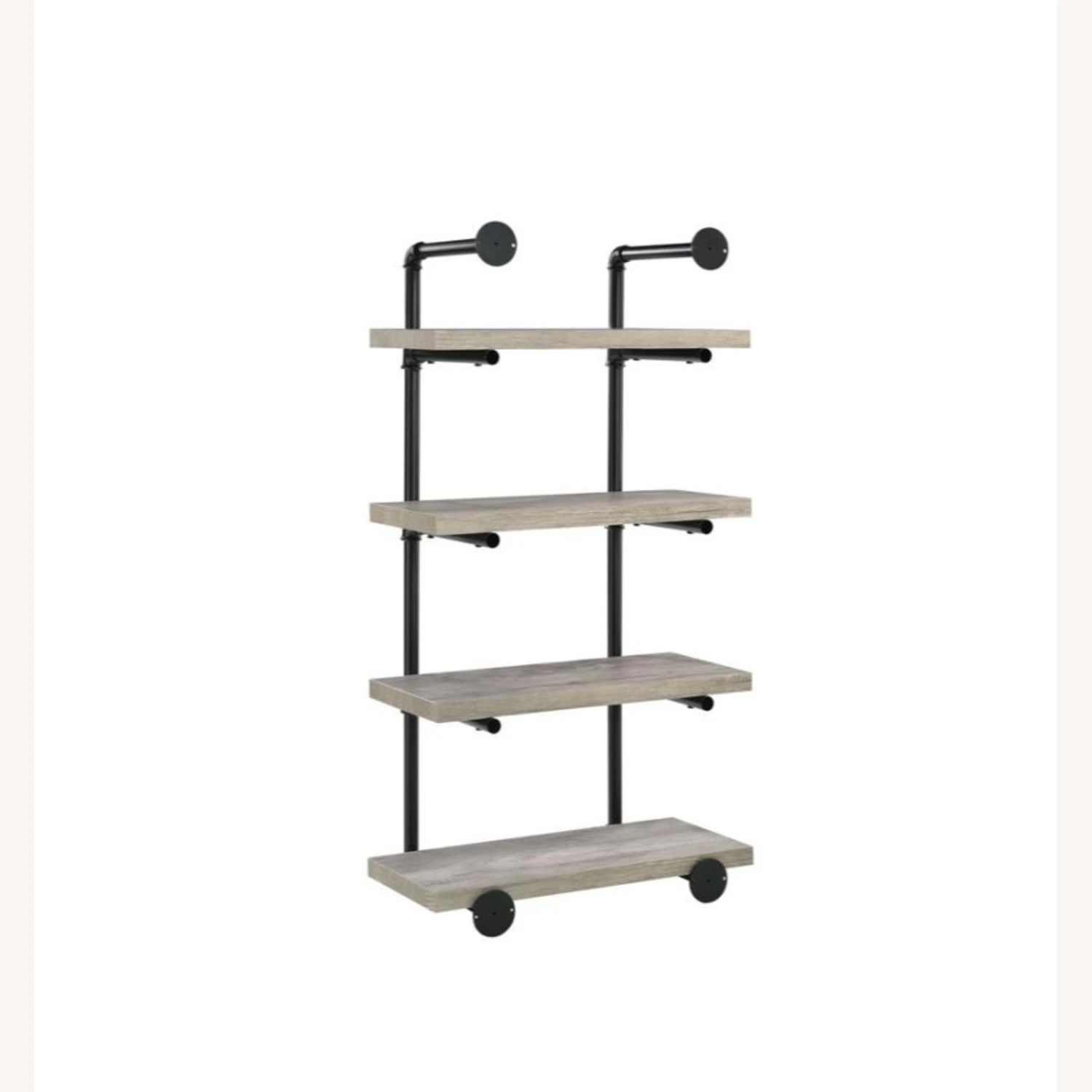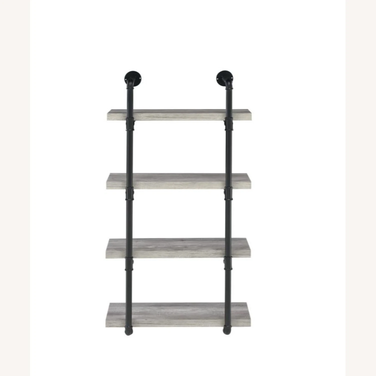 • Industrial style wall-mounted shelf in grey driftwood finish with black plumbing pipe metal frame