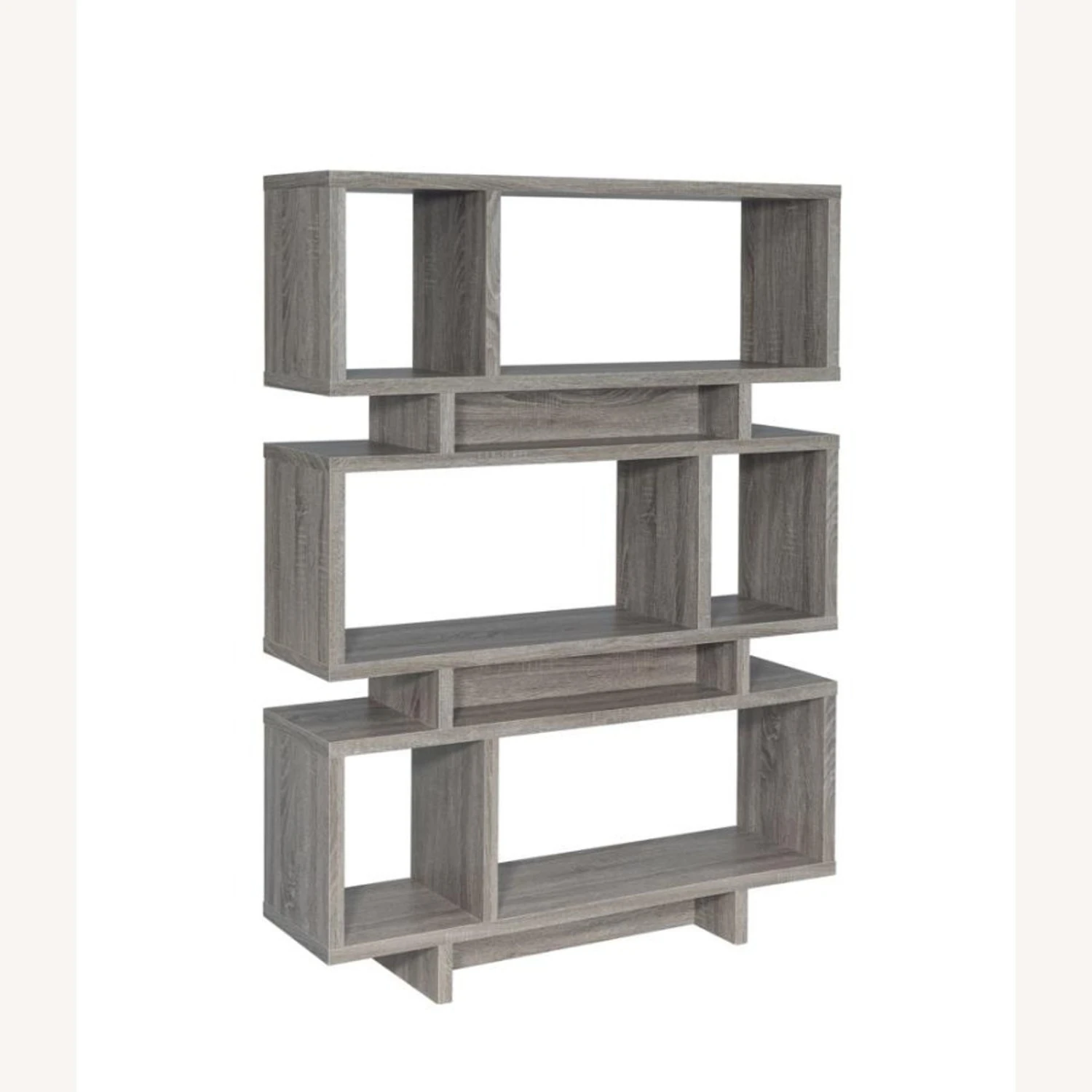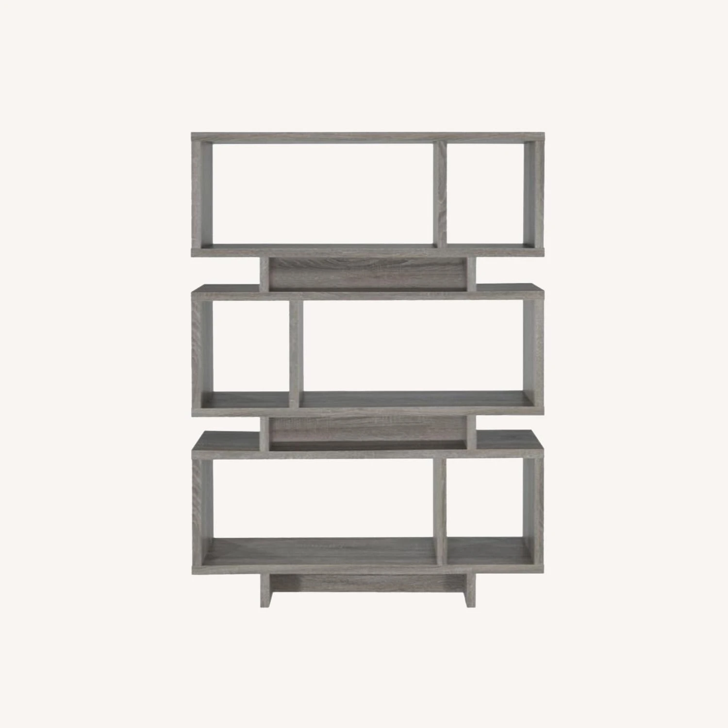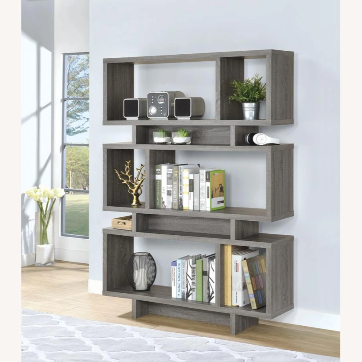 • Modern decor is showcased on the shelves of this geometric bookcase