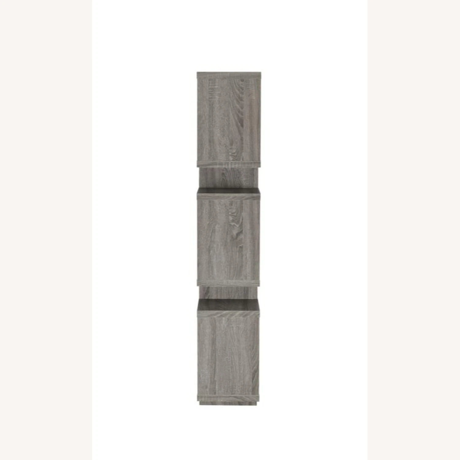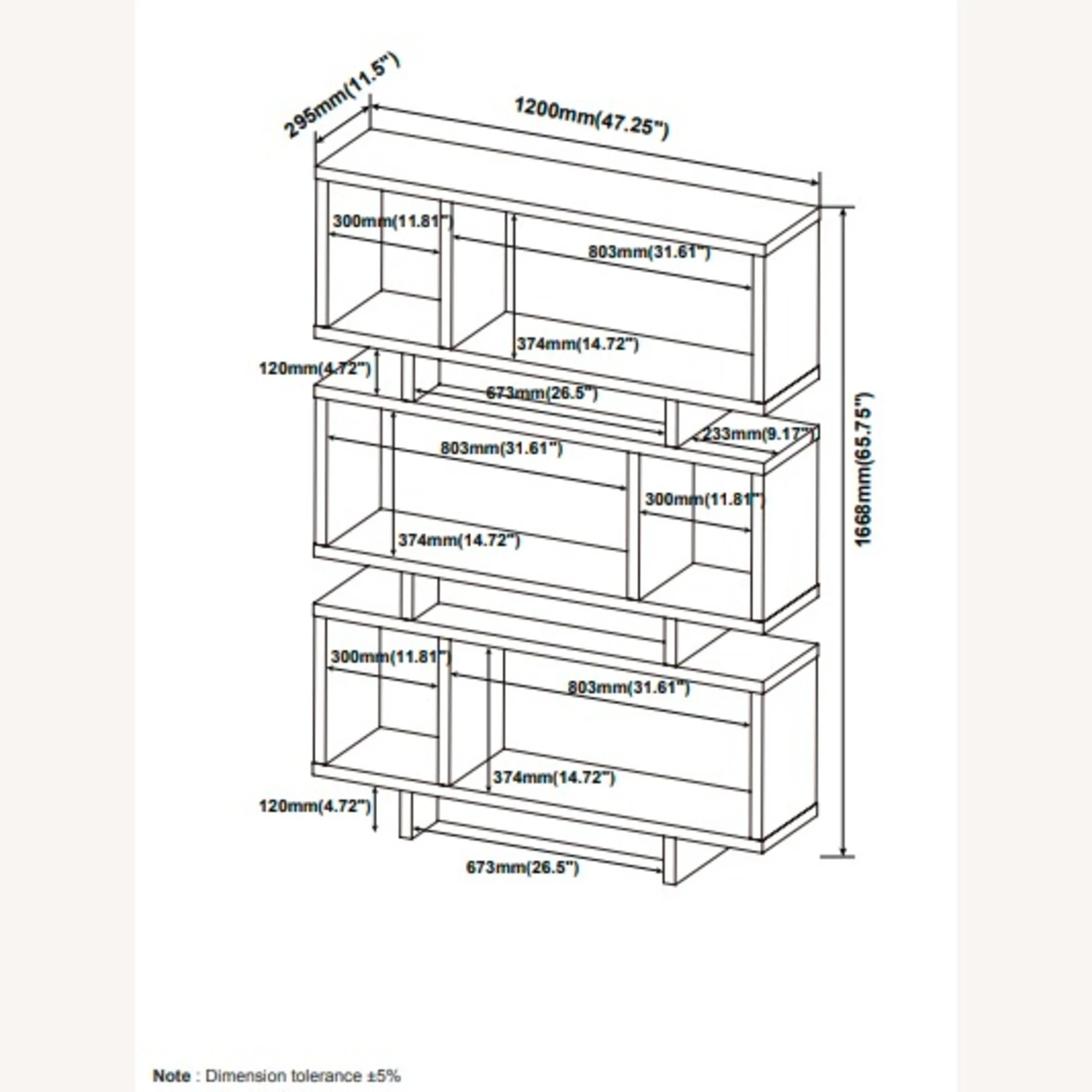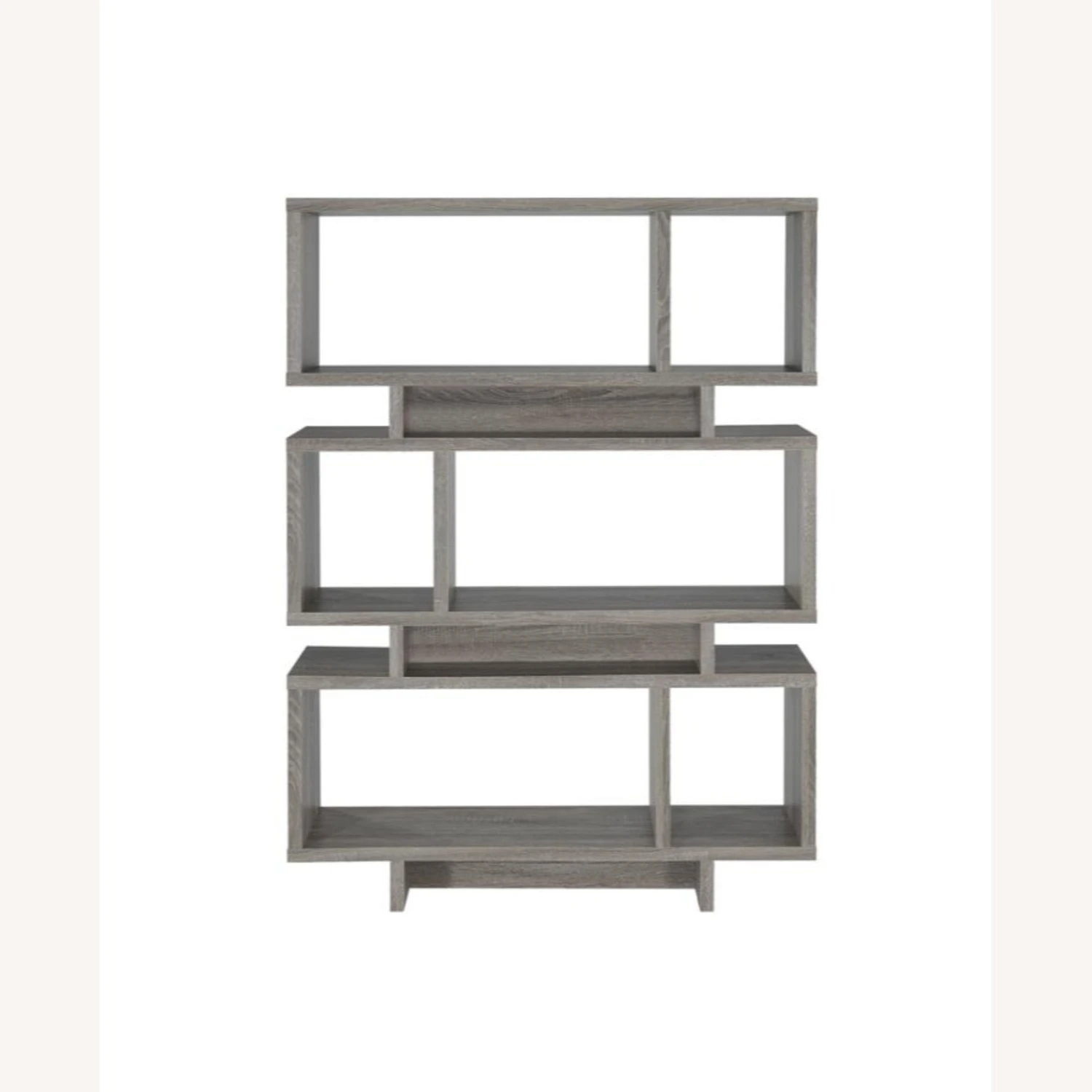 • Modern decor is showcased on the shelves of this geometric bookcase