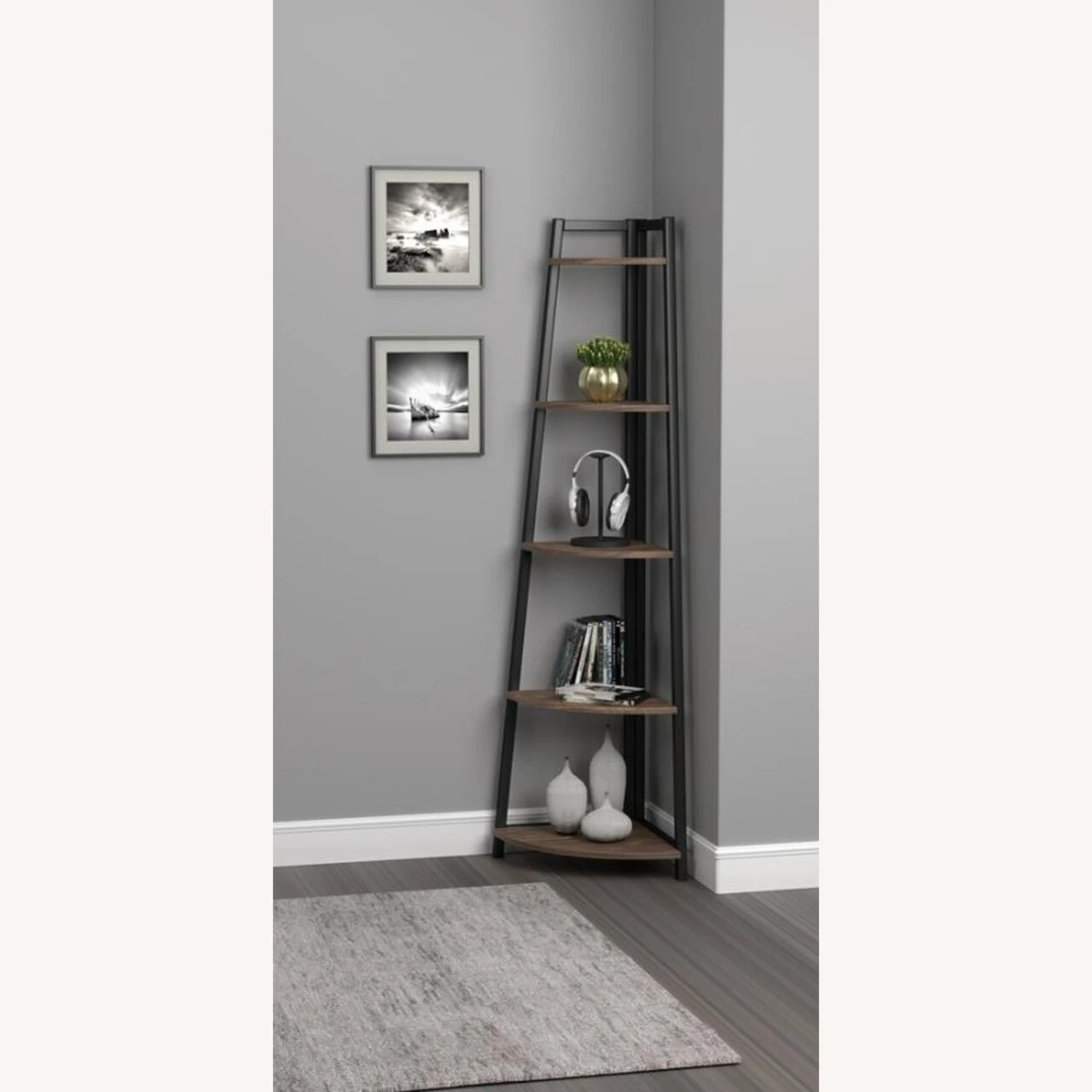 • Corner bookcase features five (5) tiers of shelving