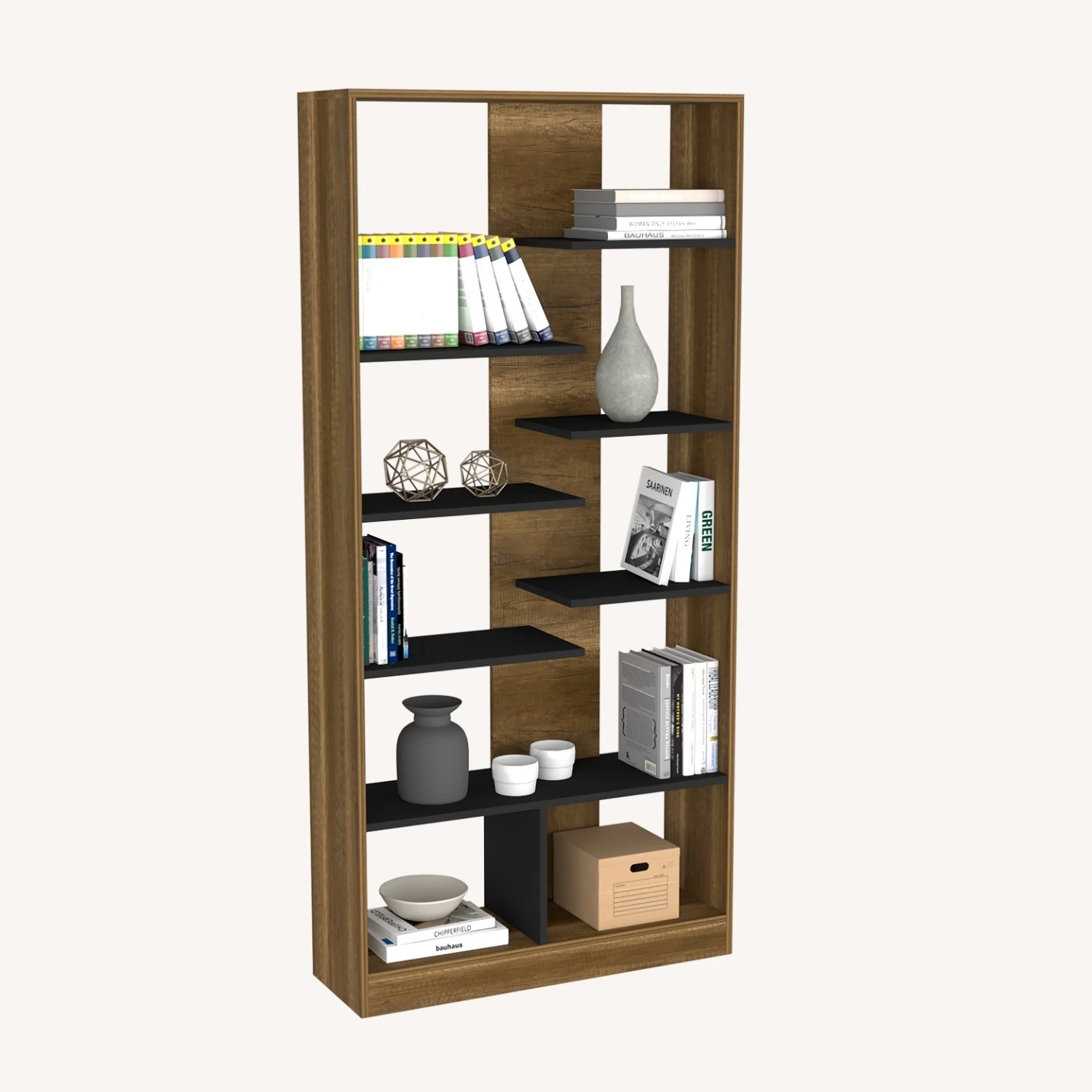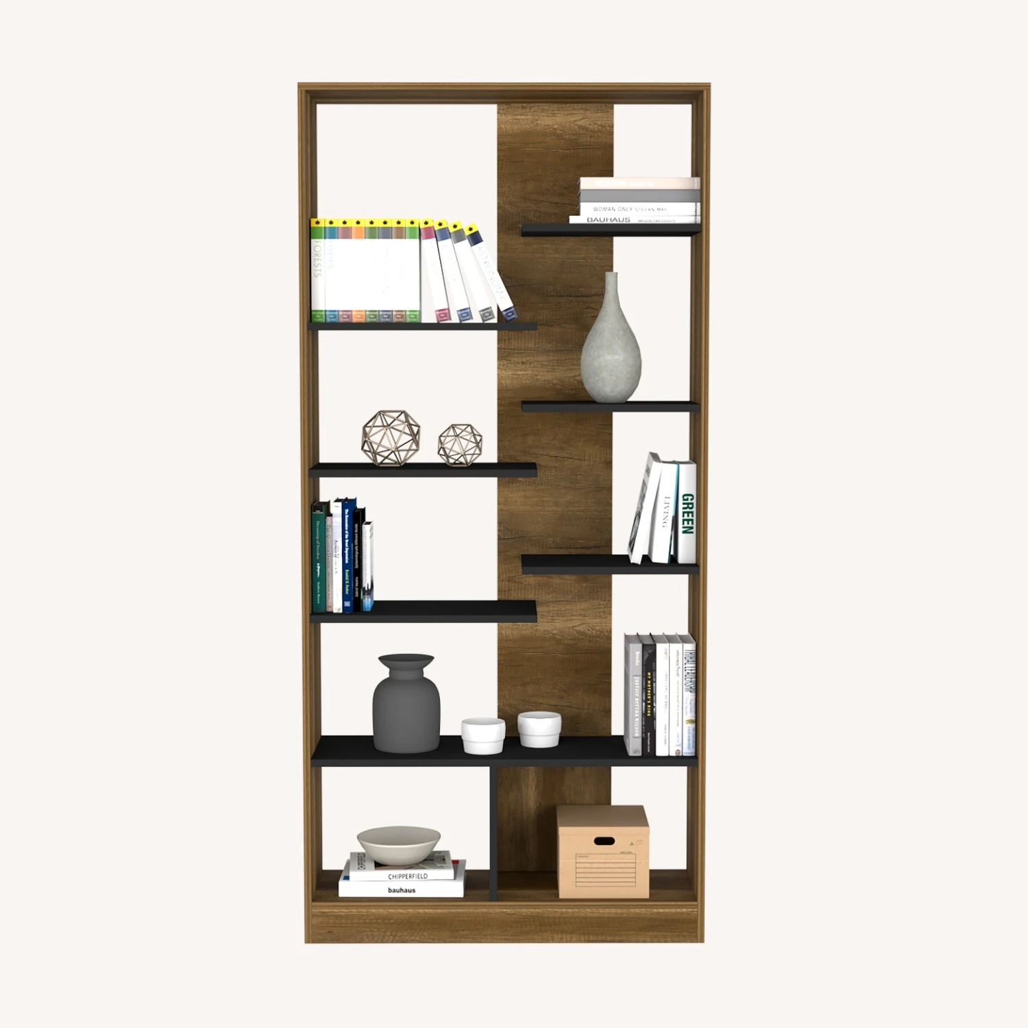 Seller’s Notes: “The Hennessy bookcase is a thing of the past with this sophisticated partitioned design. This modern bookcase includes three lower shelves(31.5”W X 10.7”H), perfect for storing your favorite books, trinkets, or collectibles. The sleek lines and compact size (31.5”W X 10,2′ ‘D X 67”H) make it a perfect addition to any living room, while the elegant tone is sure to impress your guests. Designed with elegant Dark Walnut manufactured wood finish.