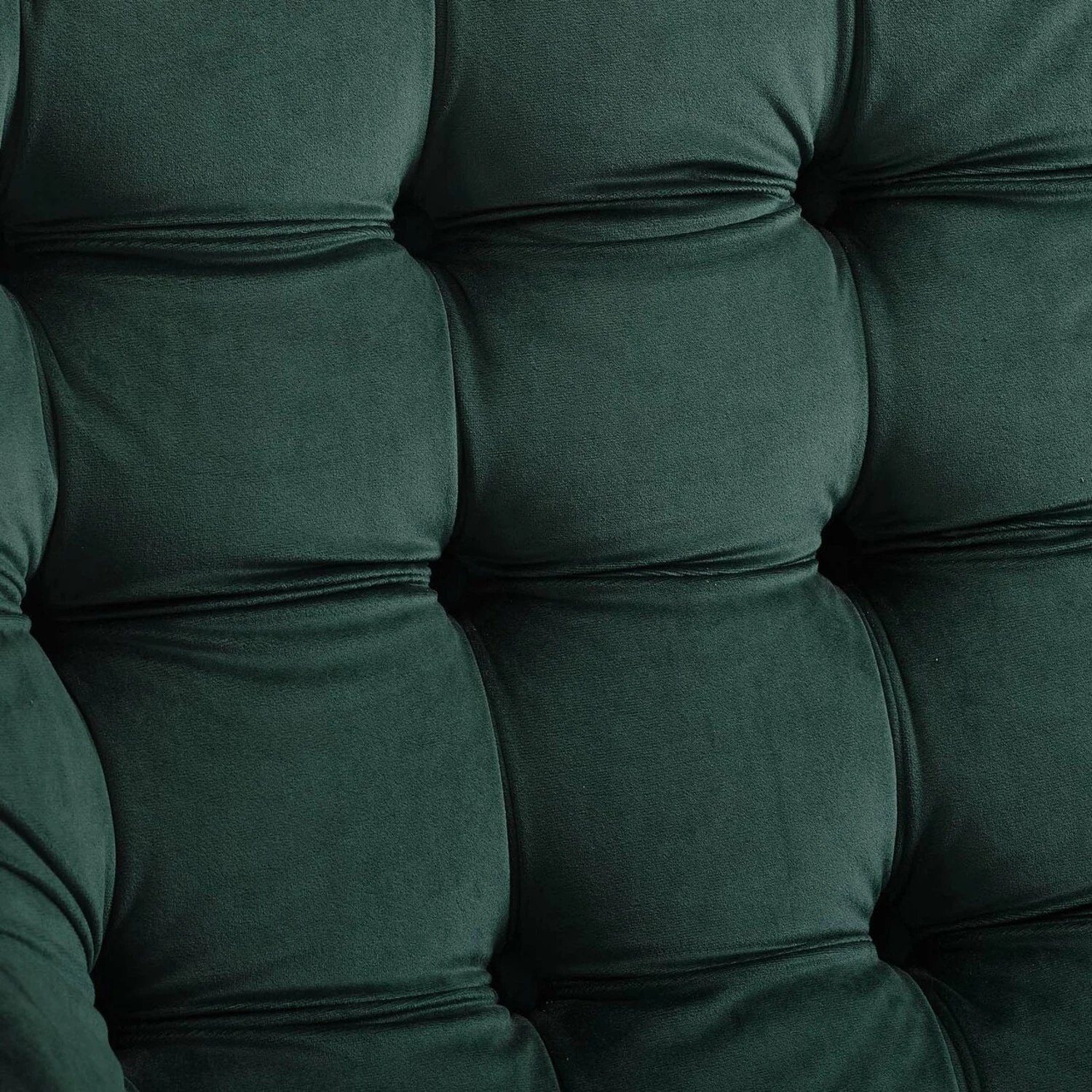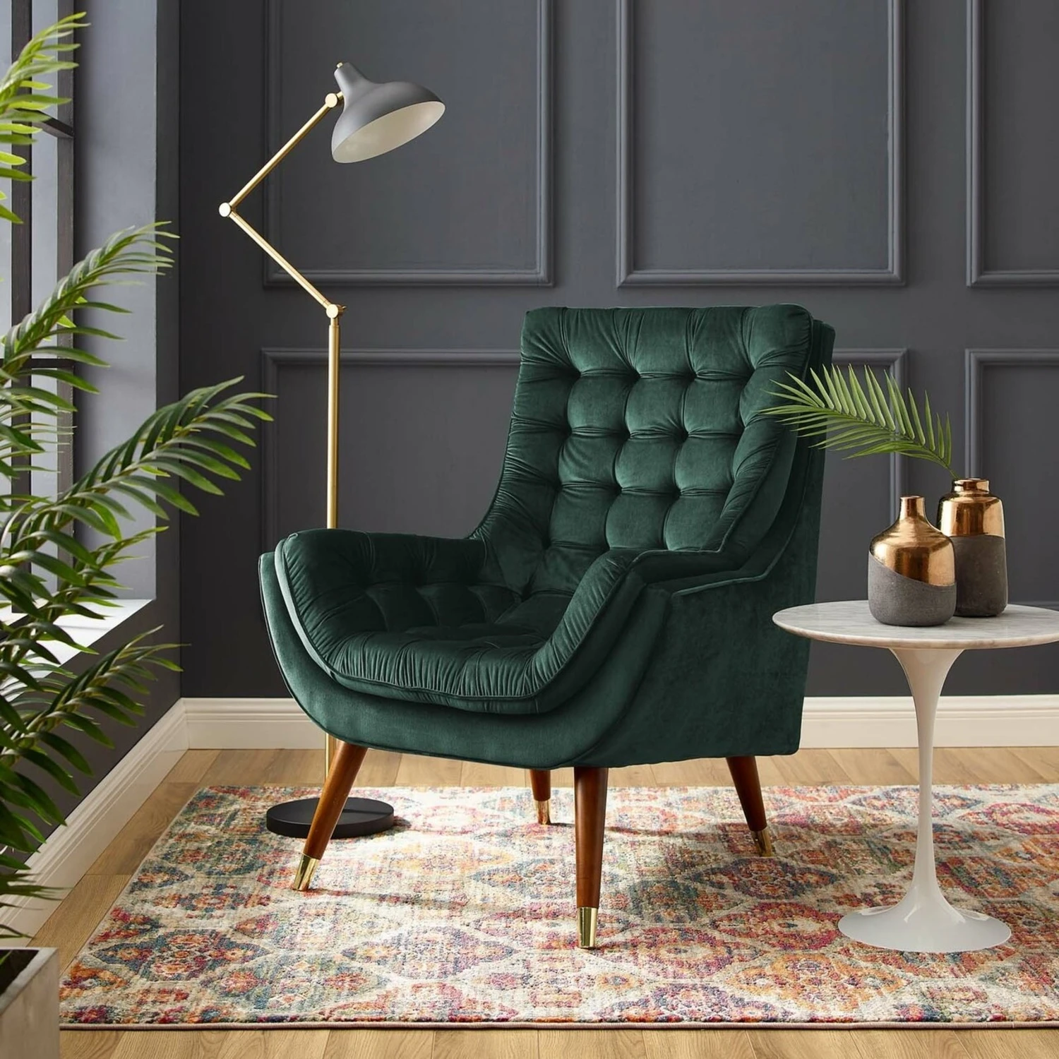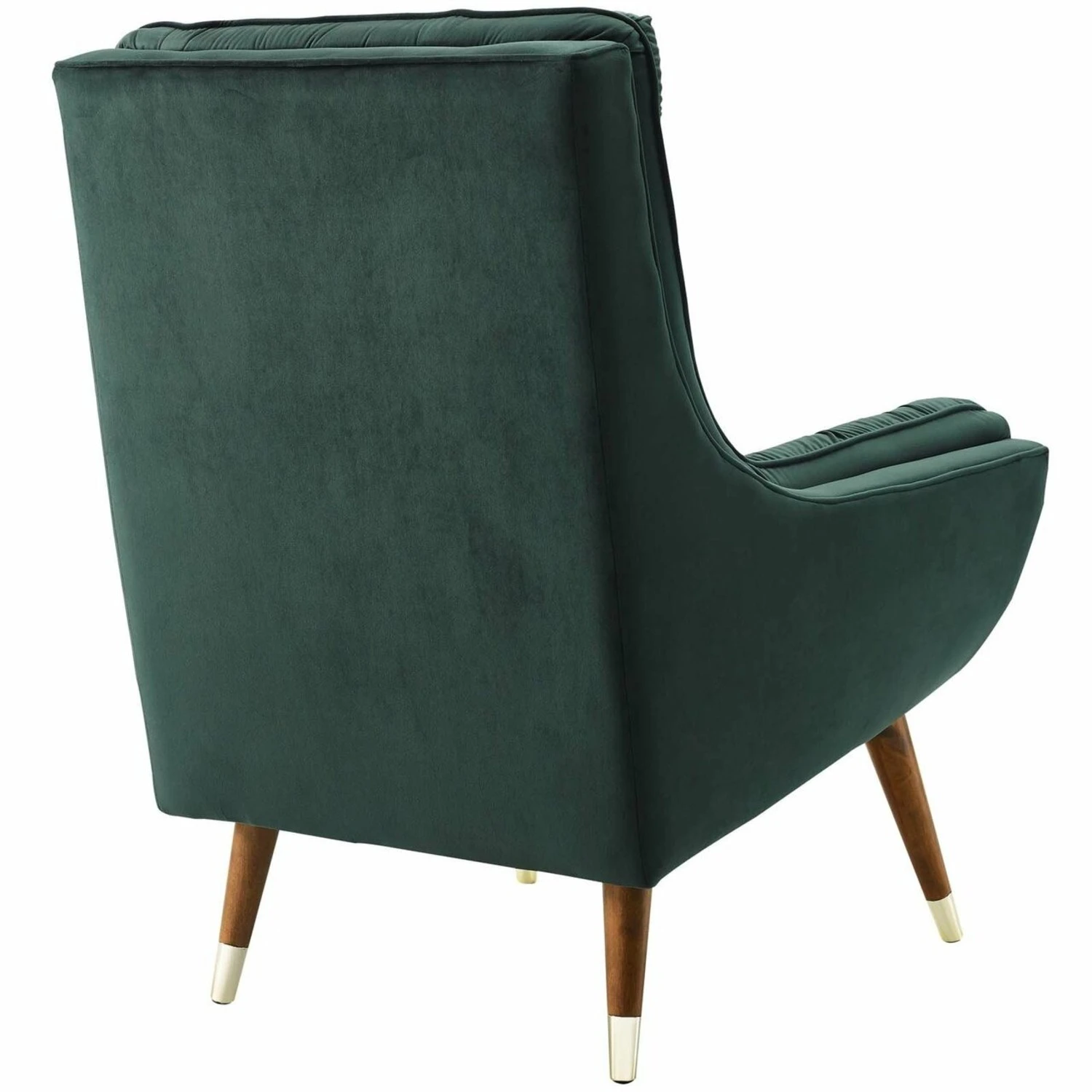 • Upholstered in stain-resistant performance velvet, this chair delivers sophistication with deep button-tufting, flared armrests, and splayed wood legs with gold metal sleeves.