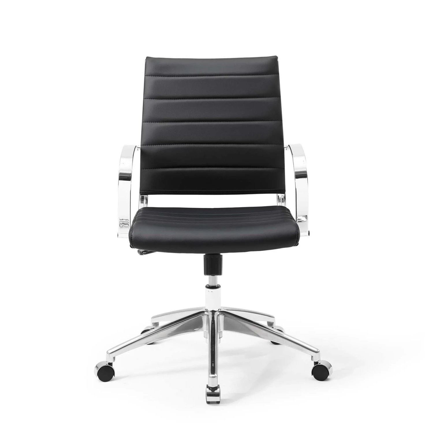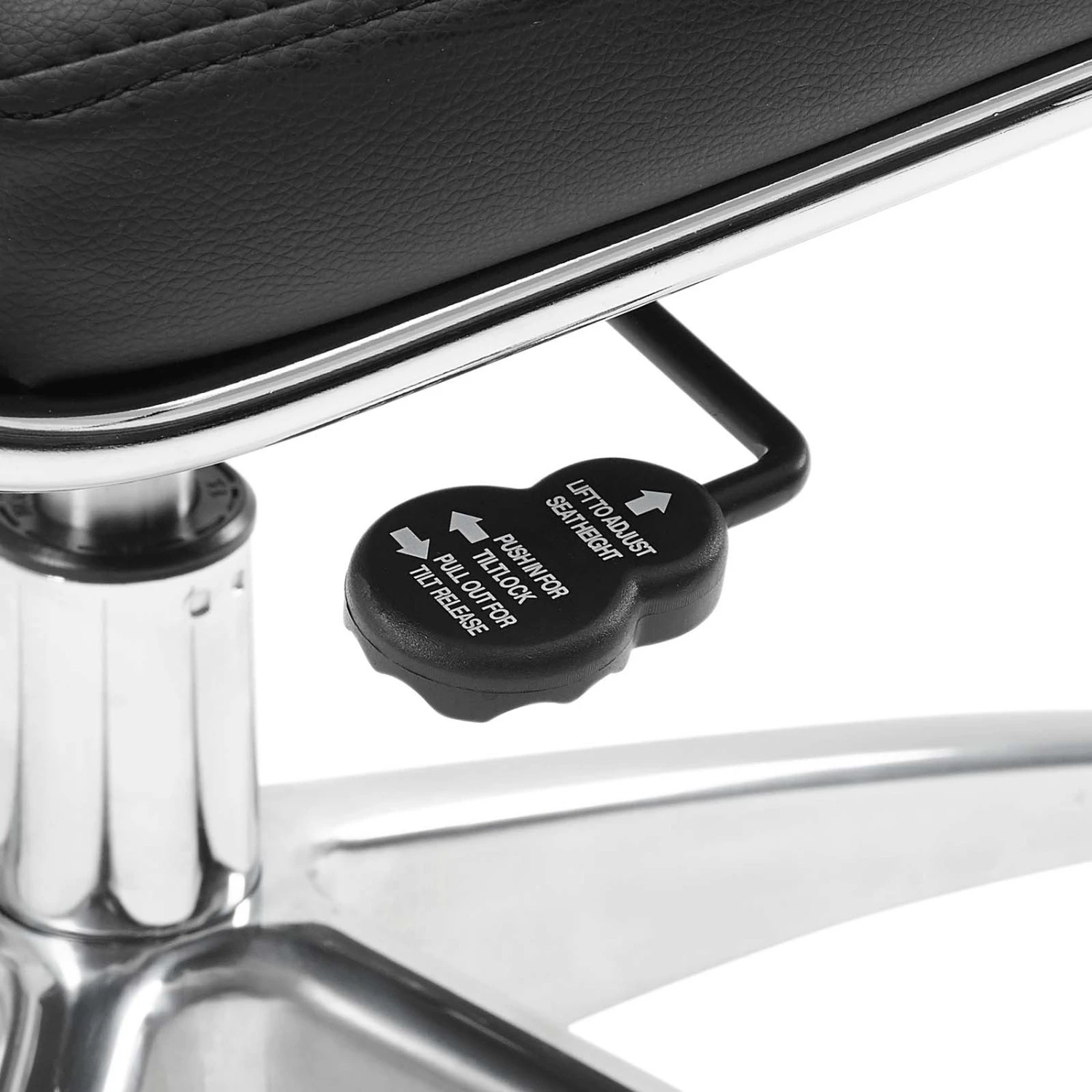 • This chair’s chrome-plated aluminum base is fitted with five dual-wheel casters, while a tension knob and tilt lock allow for easy back position adjustments.