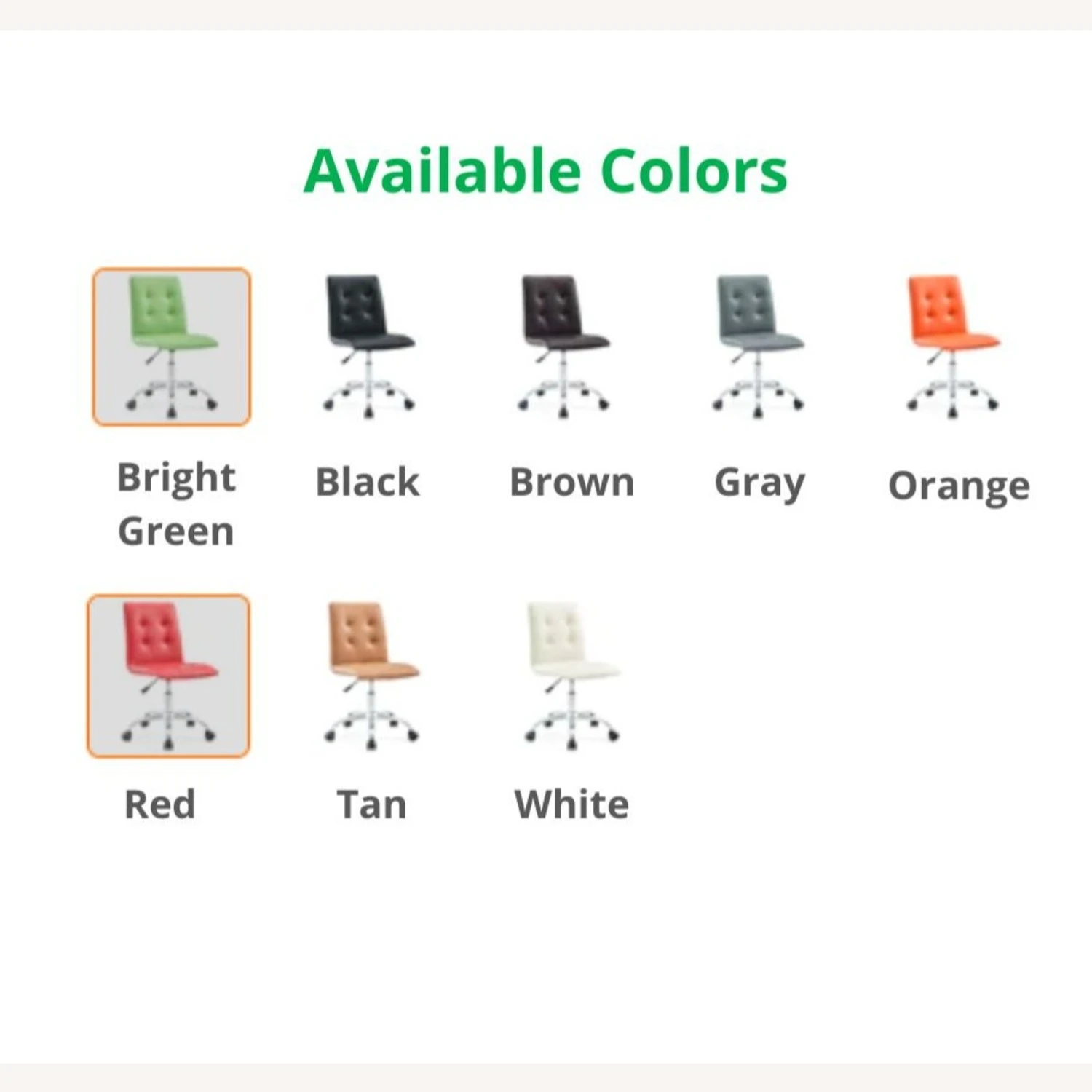 This model comes in these colors: BRIGHT GREEN, BLACK, BROWN, GRAY, ORANGE, RED, TAN, & WHITE. If you are interested in a color other than that of this listing, and if the quantity you wish to purchase is greater than what is listed here, please message us for availability.