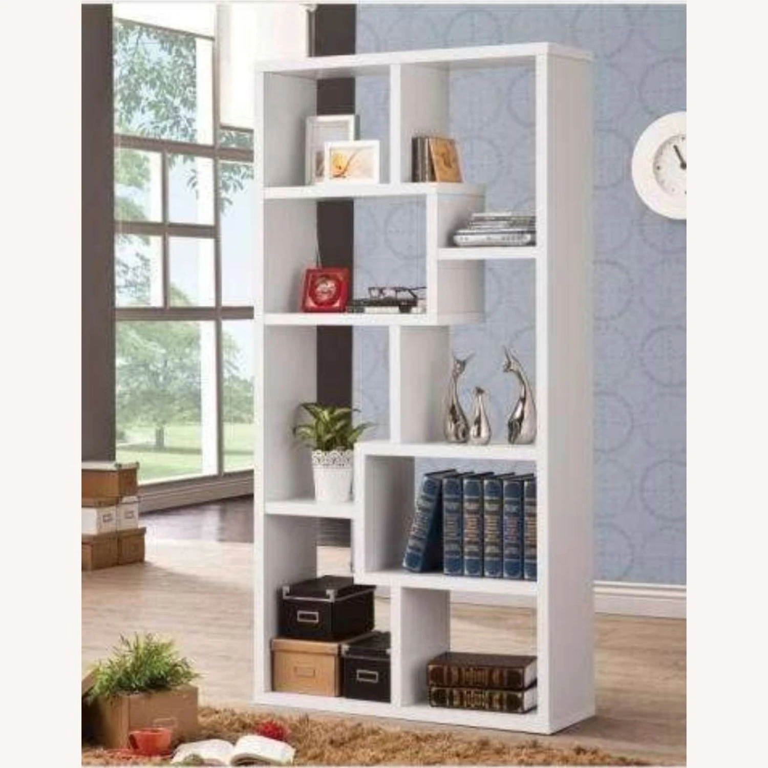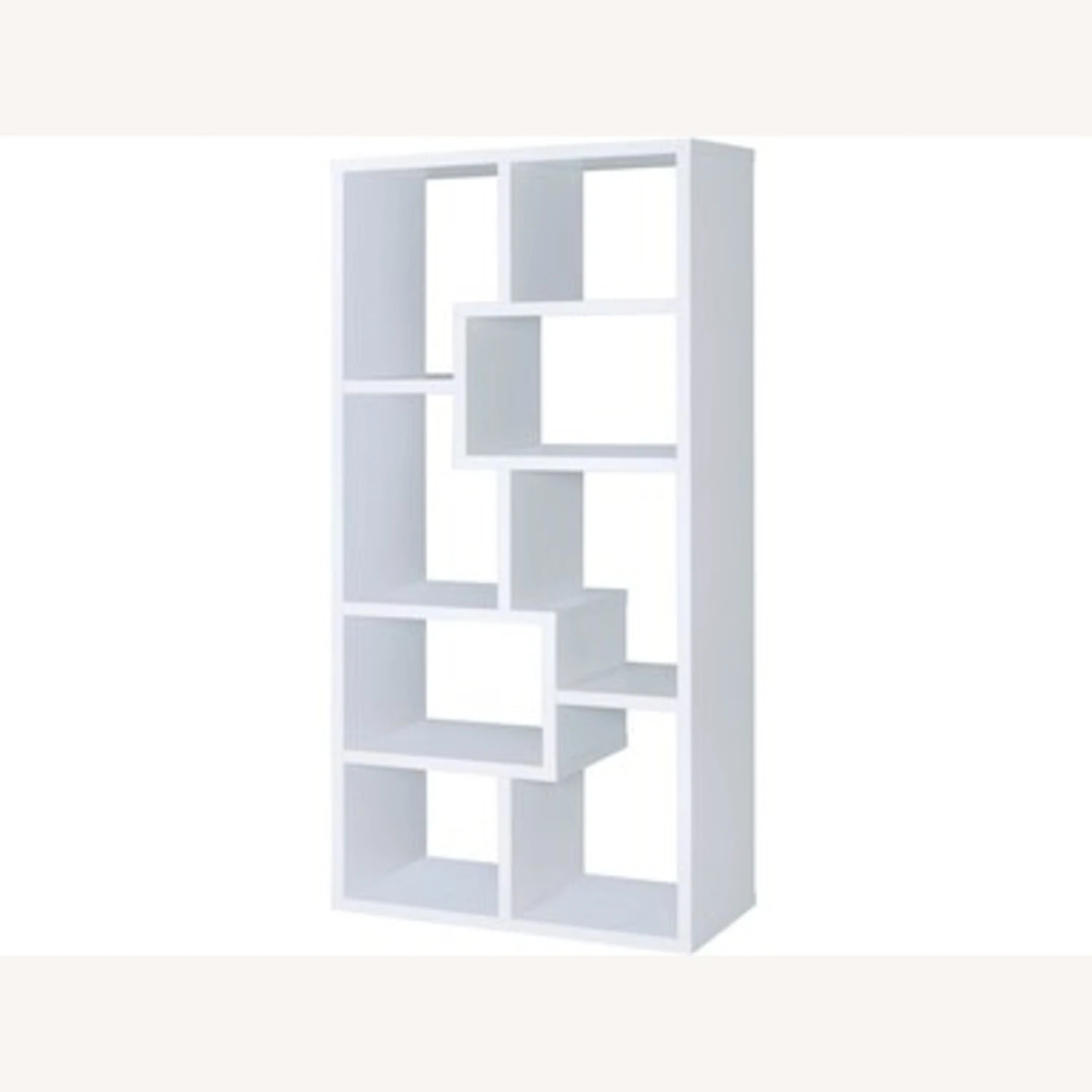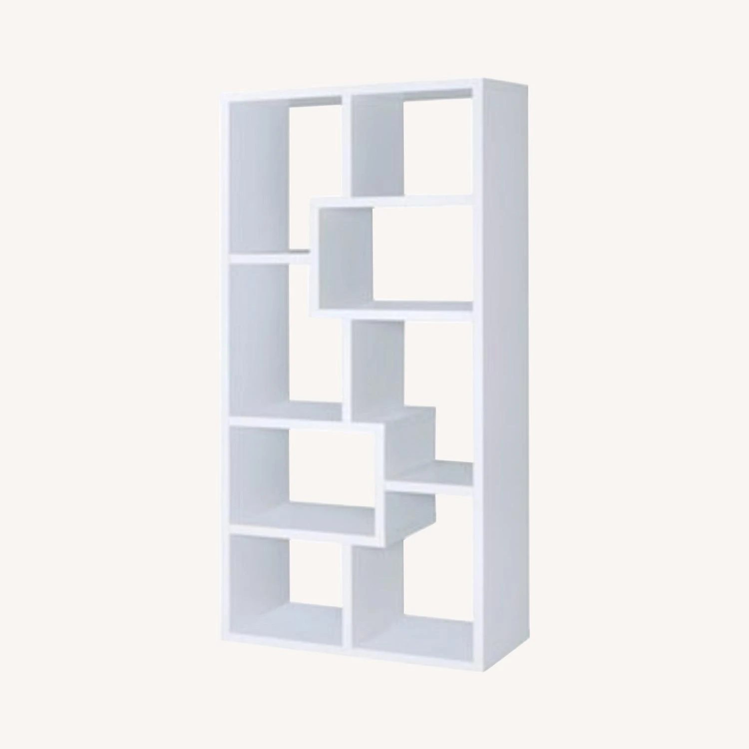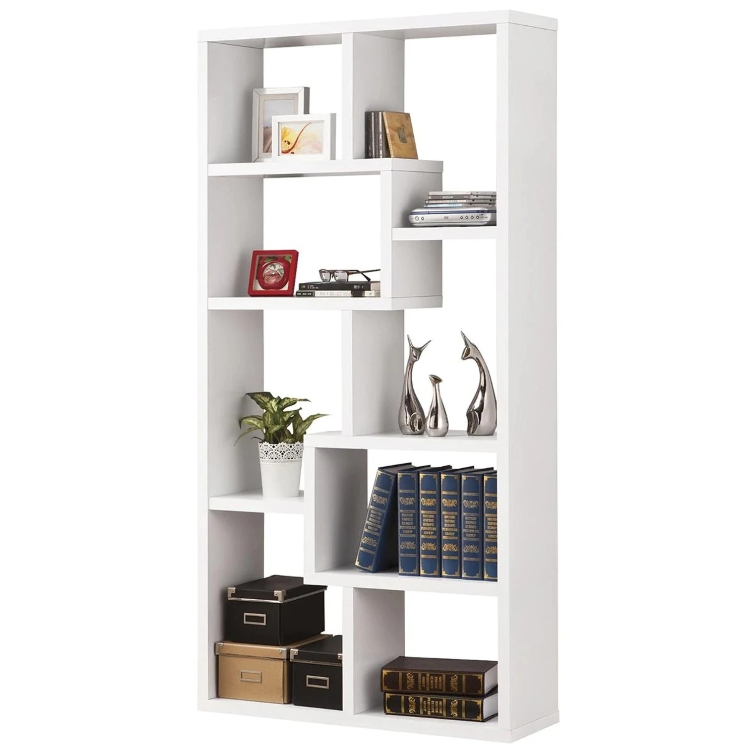 • Geometric bookcase with a seemingly random pattern of boxes creates an attention-grabbing display for your favorite keepsakes and books