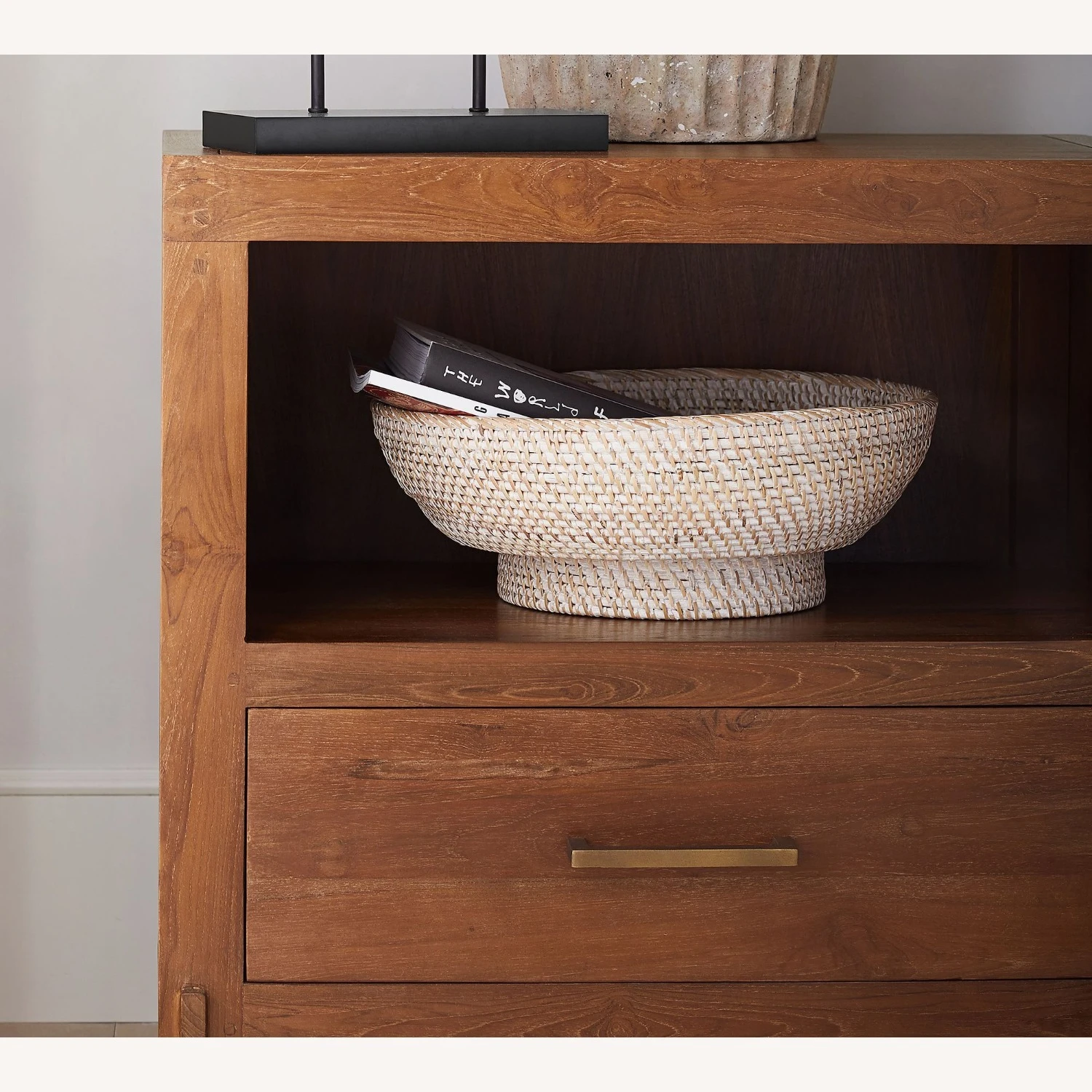 Features a Camden teak multi-step finish; hardware is made of metal and finished in antique bronze.