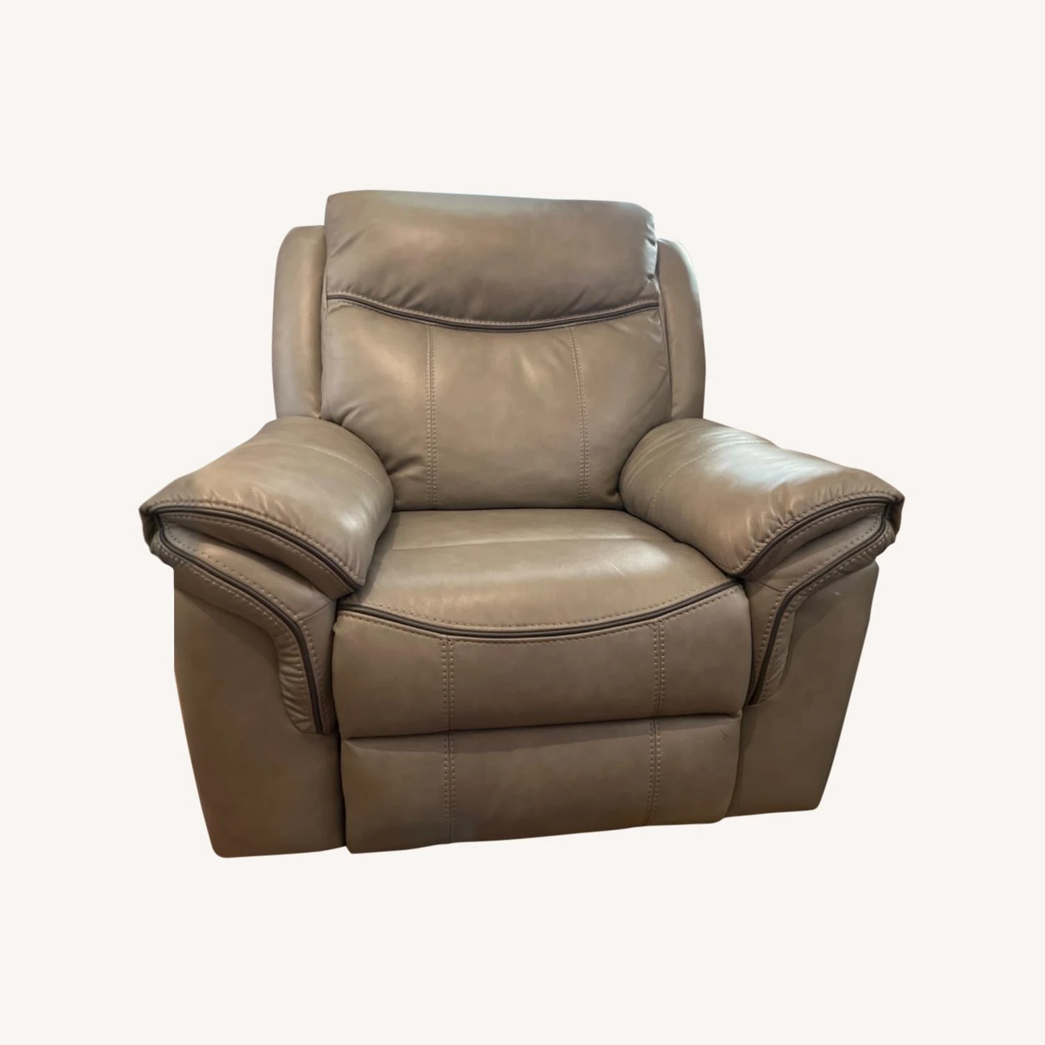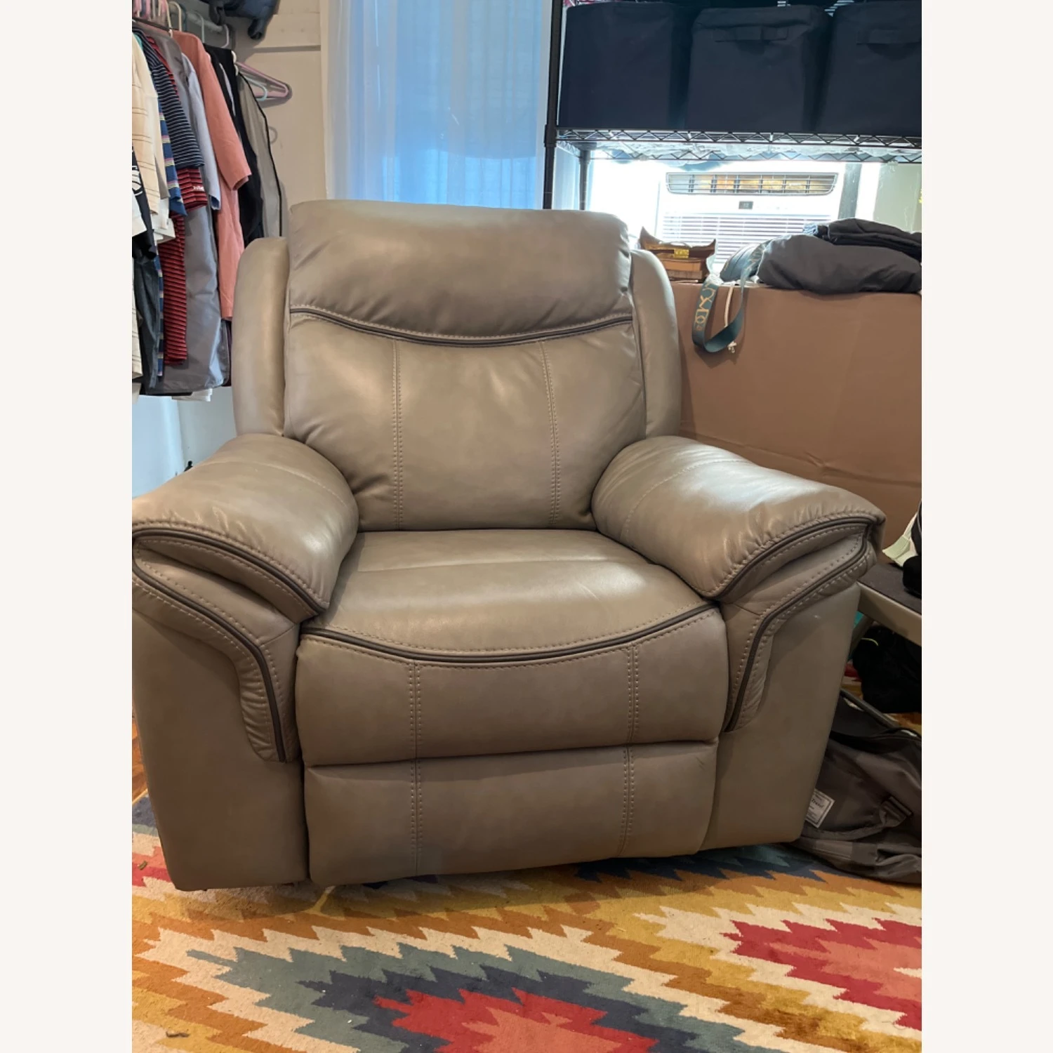 Seller’s Notes: Like new …..4 tiny white dots on right side of chair under the arm pad. Same condition as when it arrived which means the rocking recliner works, however, when you pull the recliner release lever it opens and doesn’t close with feet. You have to stand up and push with foot to close it so we just use as rocking chair. When we got delivered we realized it was too big for our apartment and we wanted to sell so we rarely use.