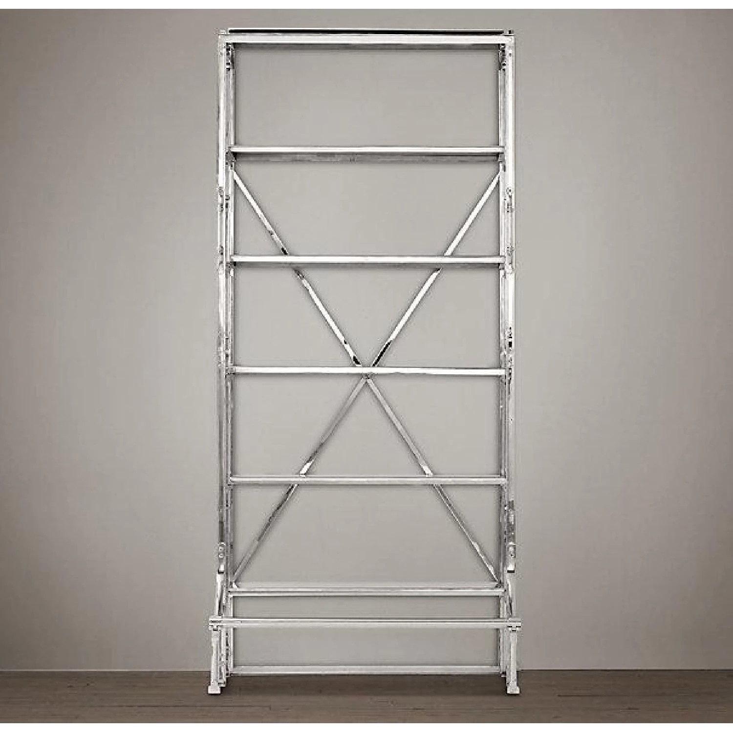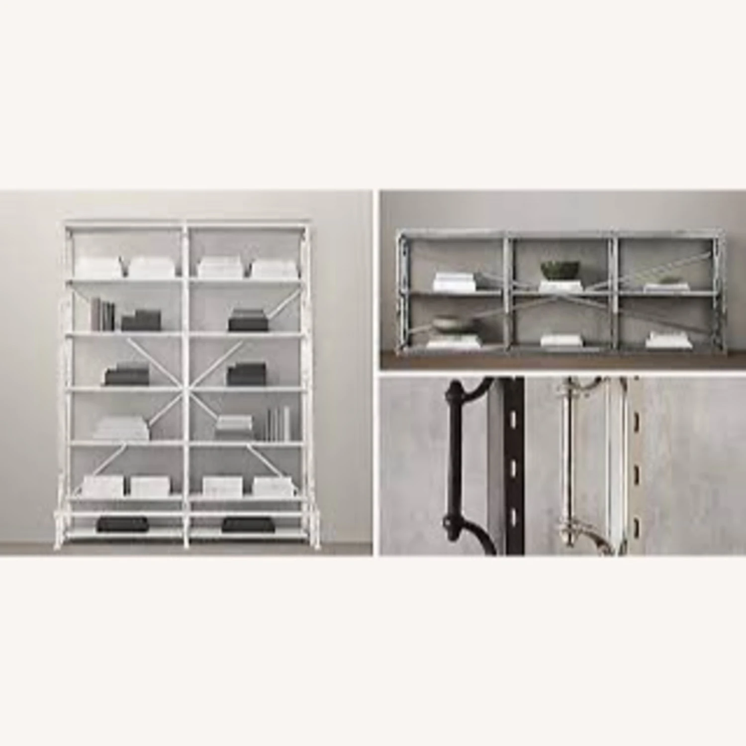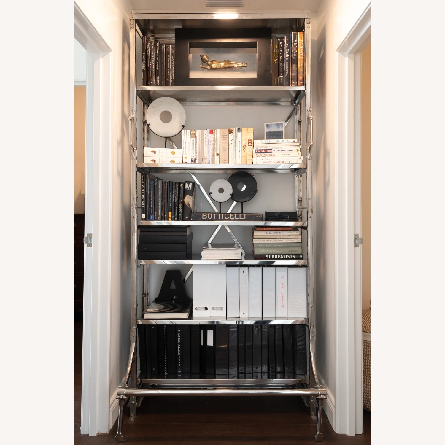 A reproduction of a mid-1940s eastern European library bookcase, ours is heir apparent to the imperfect beauty of an antique. Crafted from steel and polished nickel, it displays books and other collectibles from four open sides. Our shelving’s front handles and lower bar step are functional vestiges of its earlier employment, equipping it for moves and reaching the upper tiers as necessary.