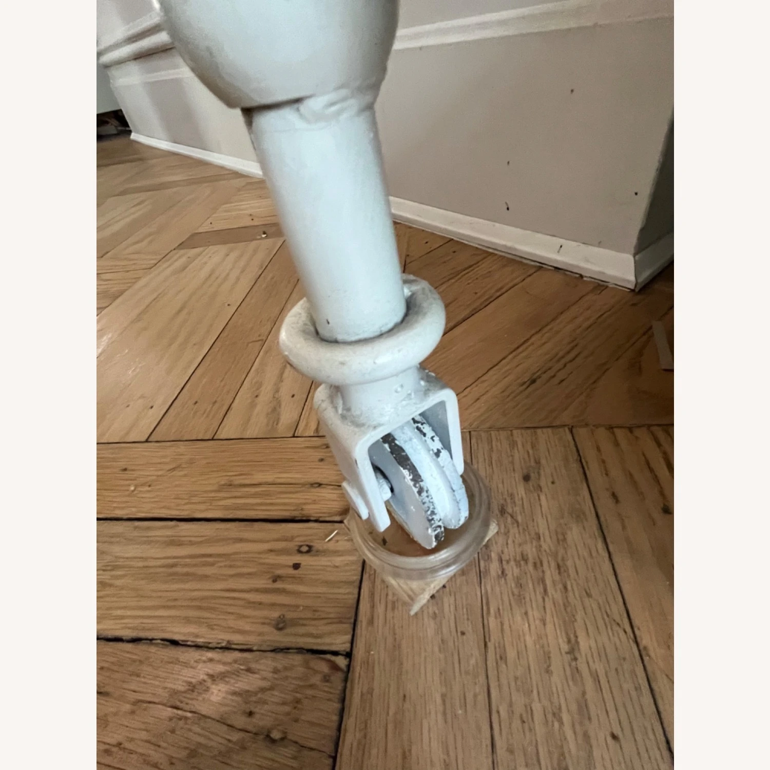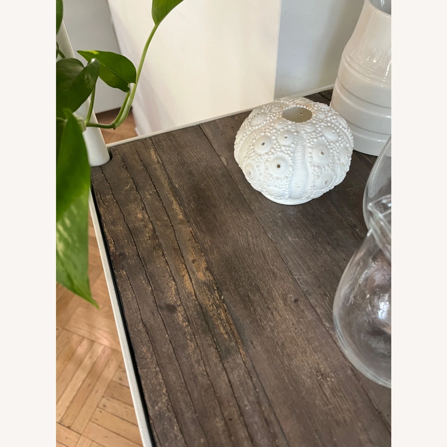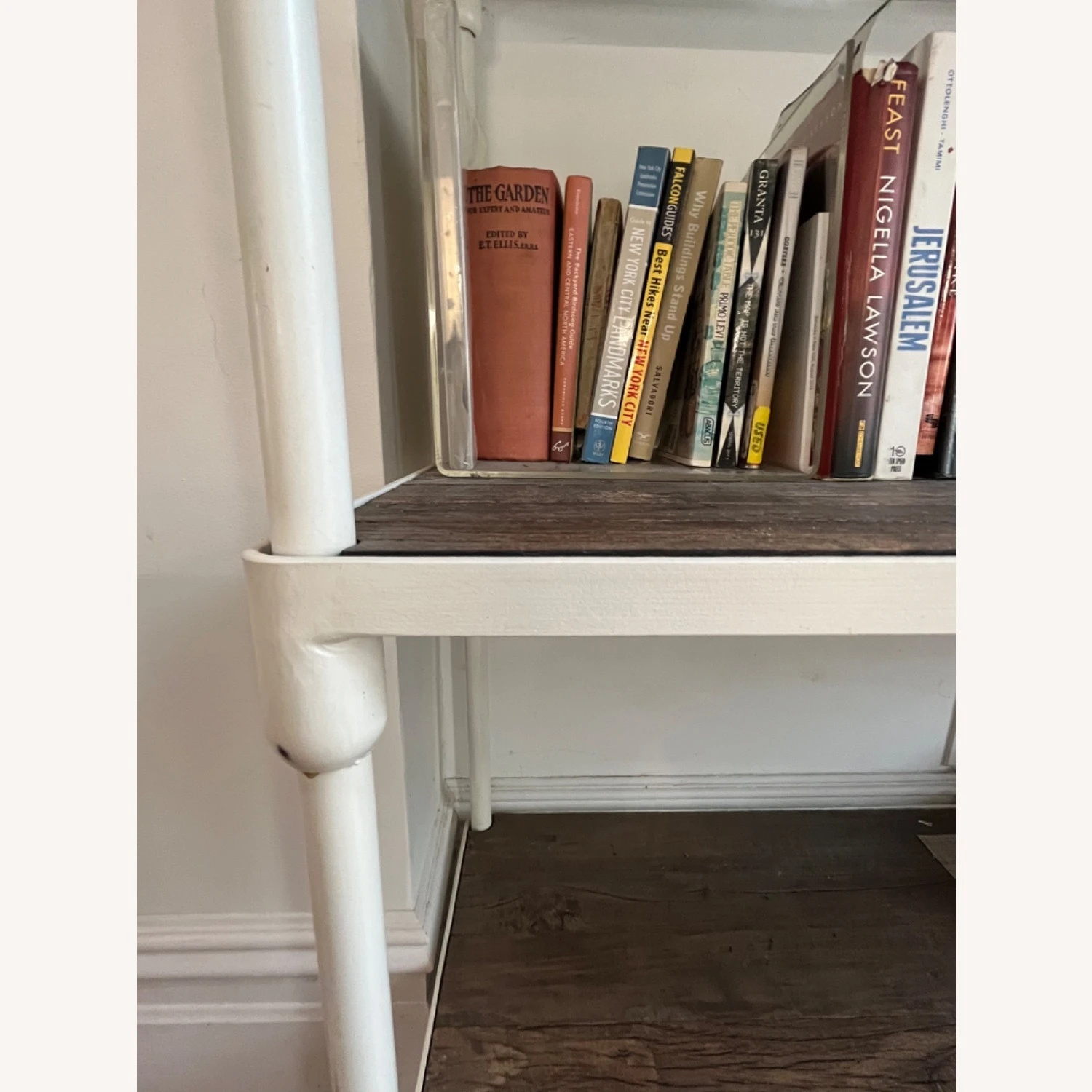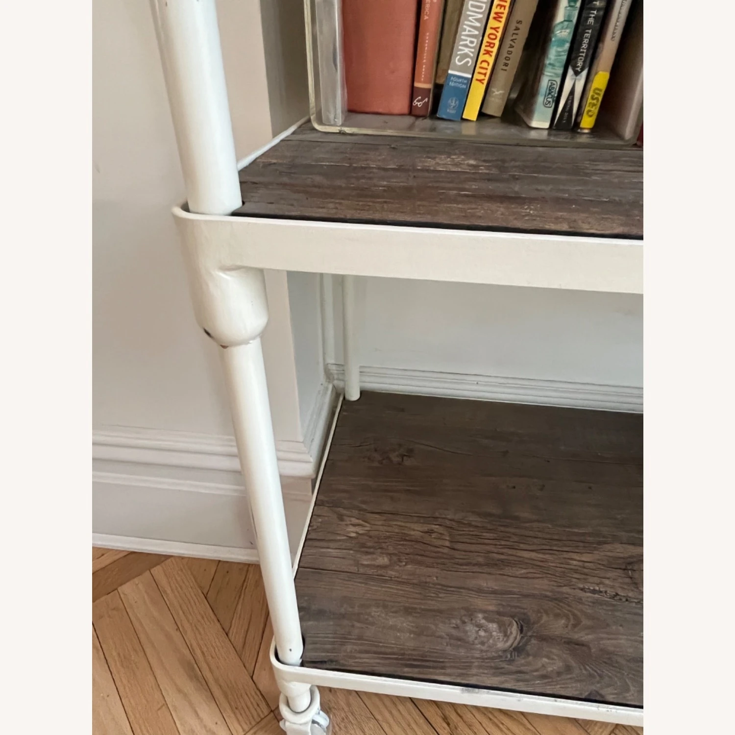 Seller’s Notes: Iconic Restoration hardware shelves from the discontinued Dutch Industrialist collection. Off white heavy duty metal frame with 6 Reclaimed Elm wood shelves including the top shelf. Spacing between each shelf is 16” H and 18 “ depth making it perfect for heavy books or large display items. These shelves will look spectacular in any living or loft space. The entire shelves stands on matching off white wheels to make it easy to move and reconfigure your layout.