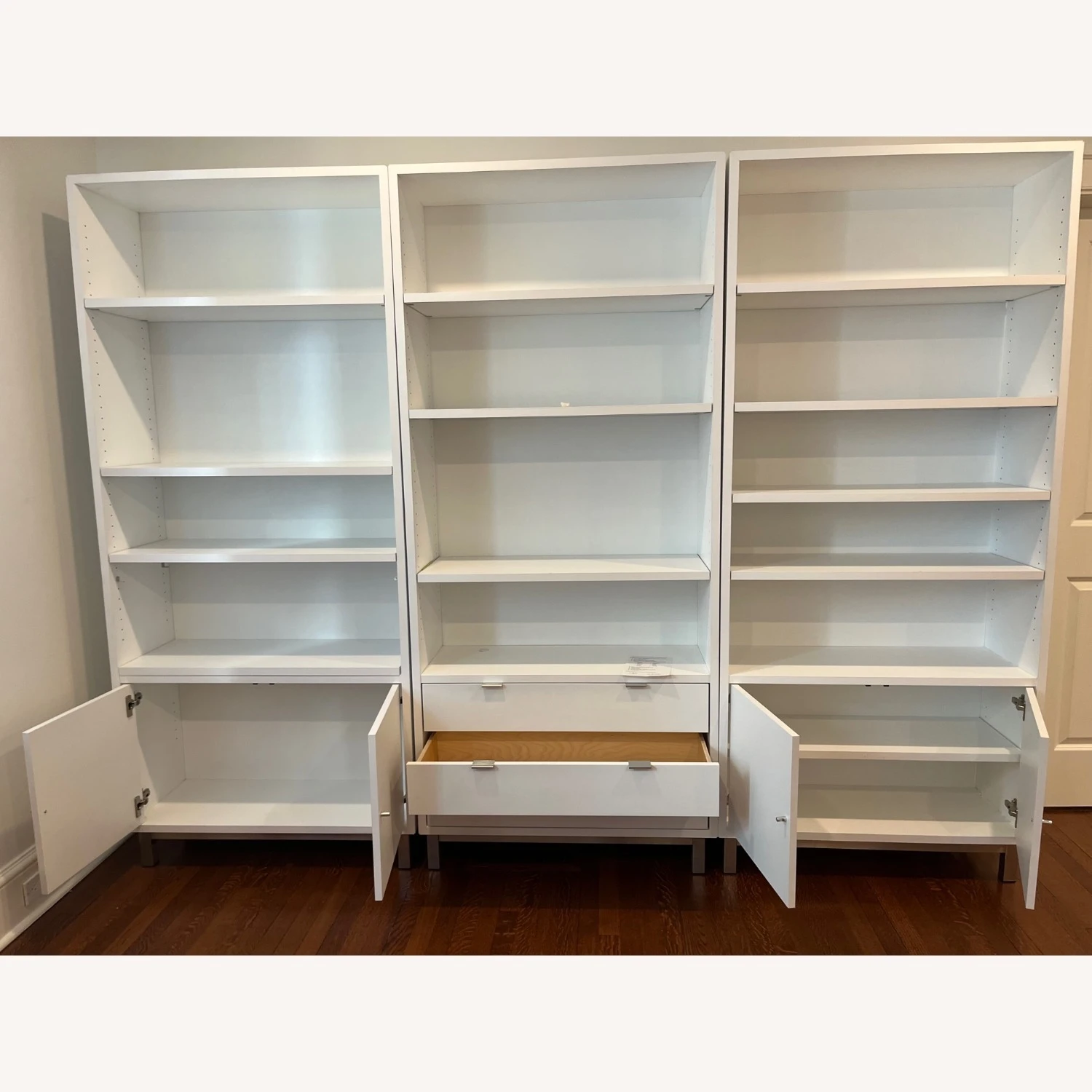 Seller’s Notes: Moving Sale – These are three separate 36″ wide bookshelves sold together. The middle unit has three drawers, the side units have shelving. Excellent condition, very lightly used.