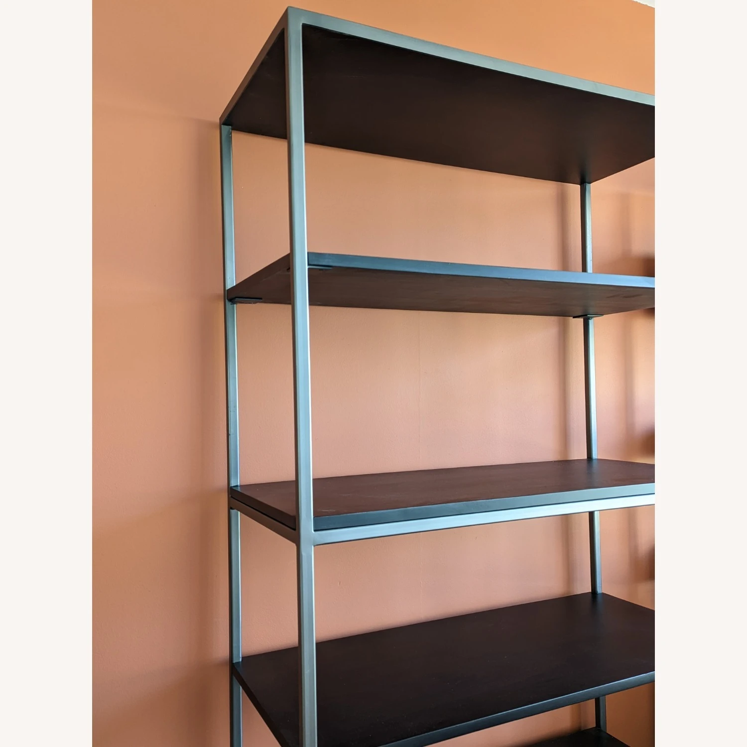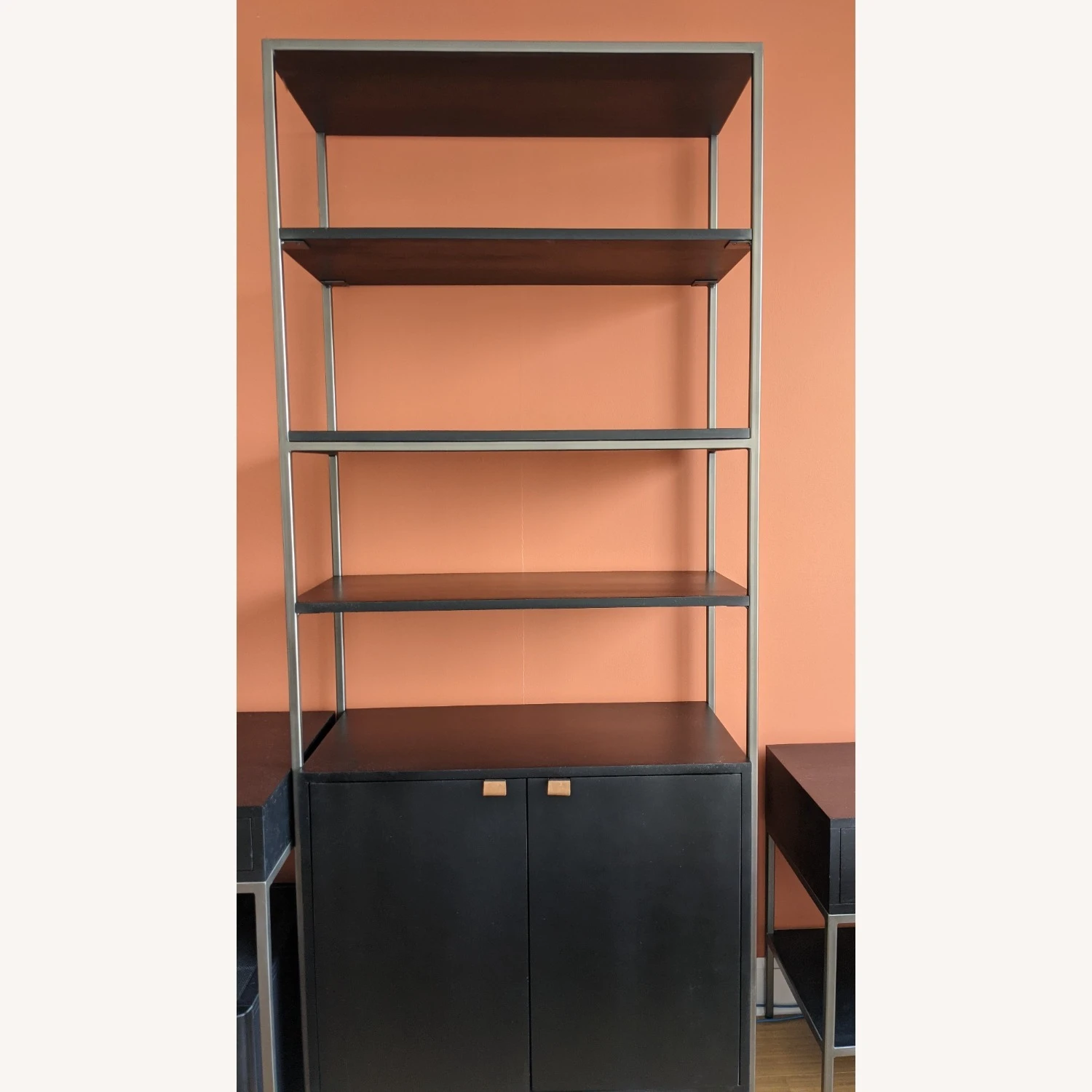 Seller’s Notes: Inspired by clean mid-century design, a stylish bookcase of solid, black-washed poplar offers to bring elegant design with ample storage. Beautiful natural wood lends an air of elegance to its surroundings, and the metal-secured leather pull adds a textural element of surprise.