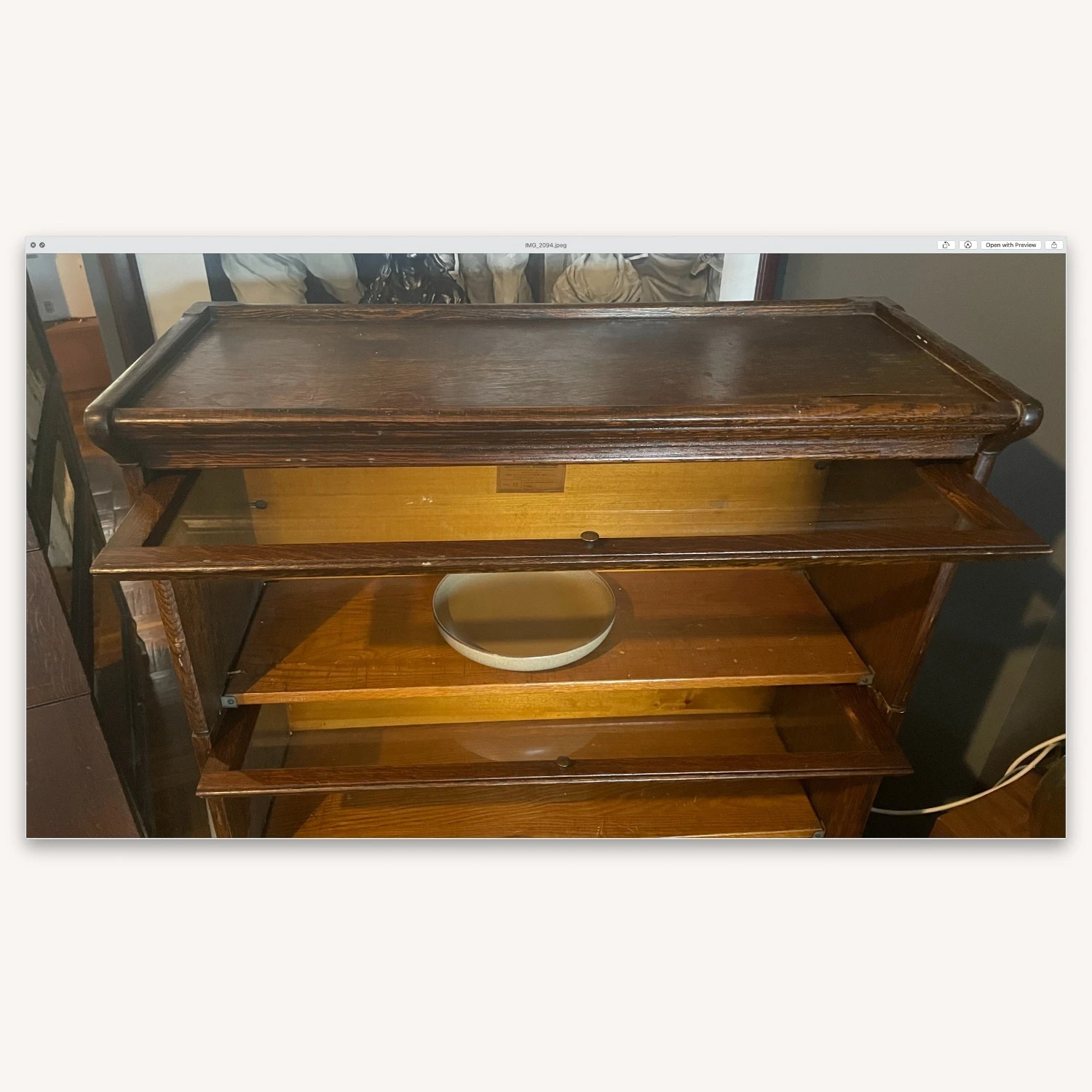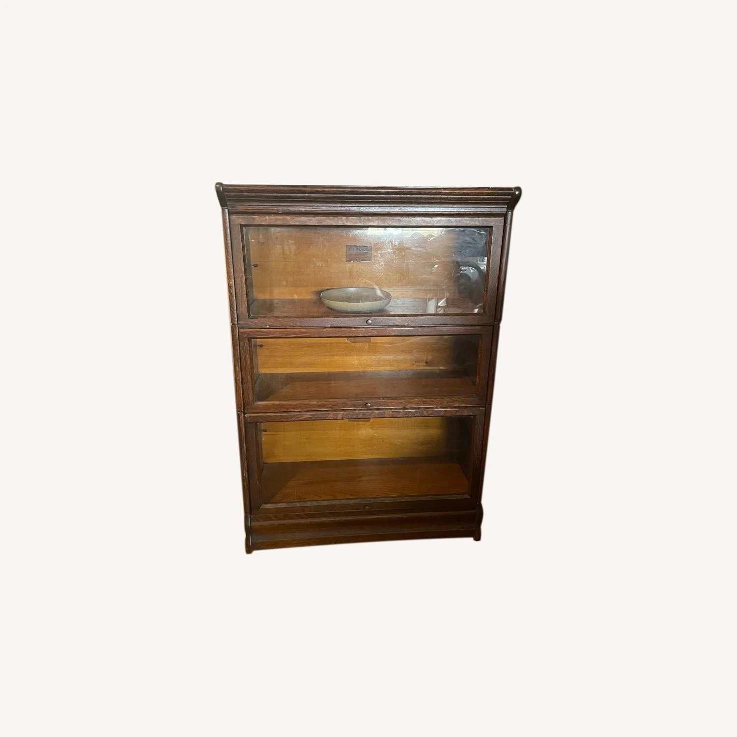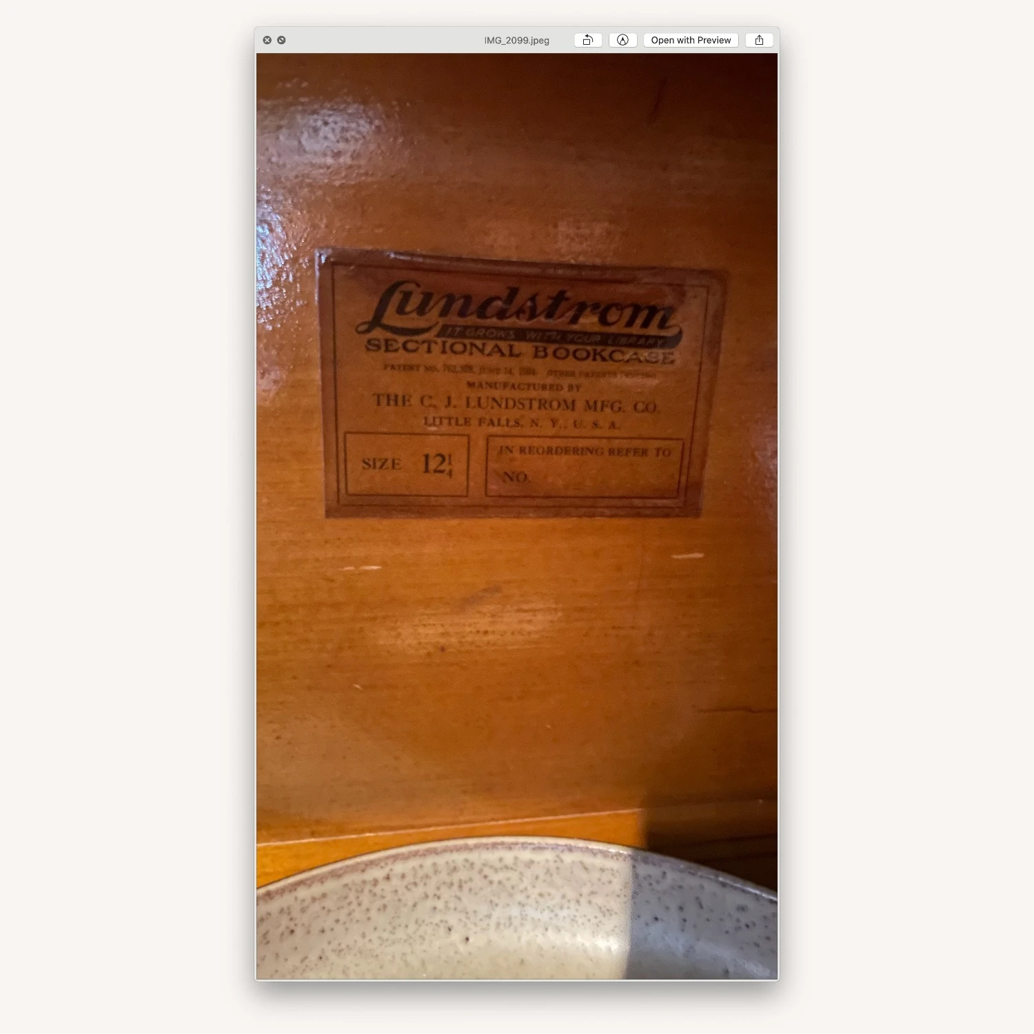 Seller’s Notes: Vintage barrister bookcase by Lundstrom has a unique configuration with three glass door stacks. With original brass knobs and original maker’s tags. Stackable.