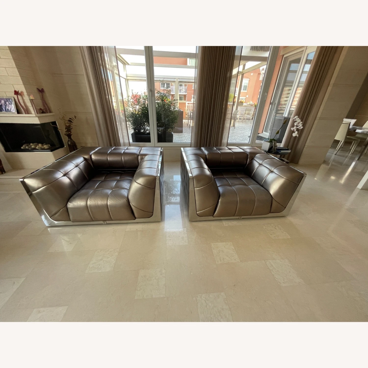 Seller’s Notes: Visionnaire – Reymond electric recliner chairs, leather metallic brown color with comfort pillows made of the same leather . Italian made and imported in the beginning of 2015 directly from the Factory. some leather discolorations from day to day use. part of a larger set ( sofa and ottoman sold separately )