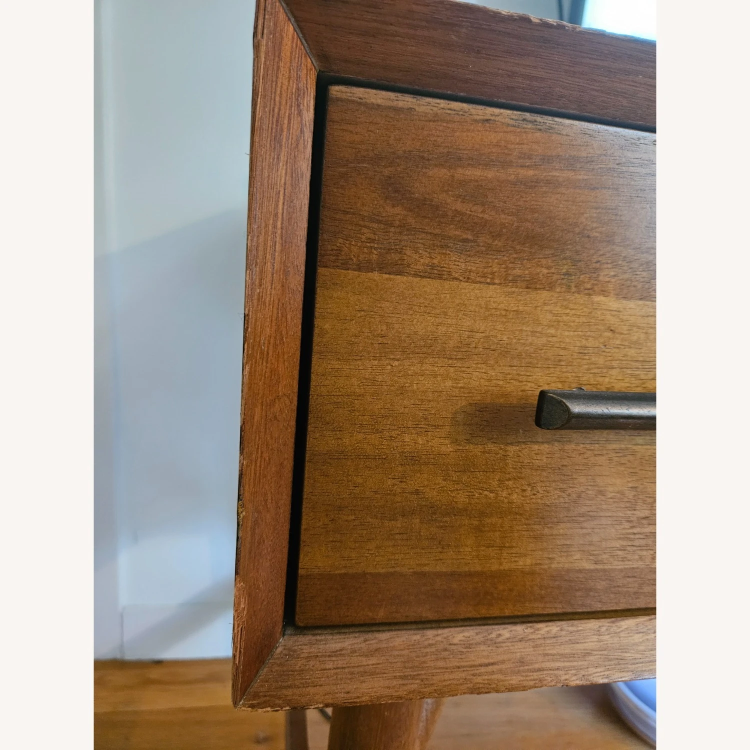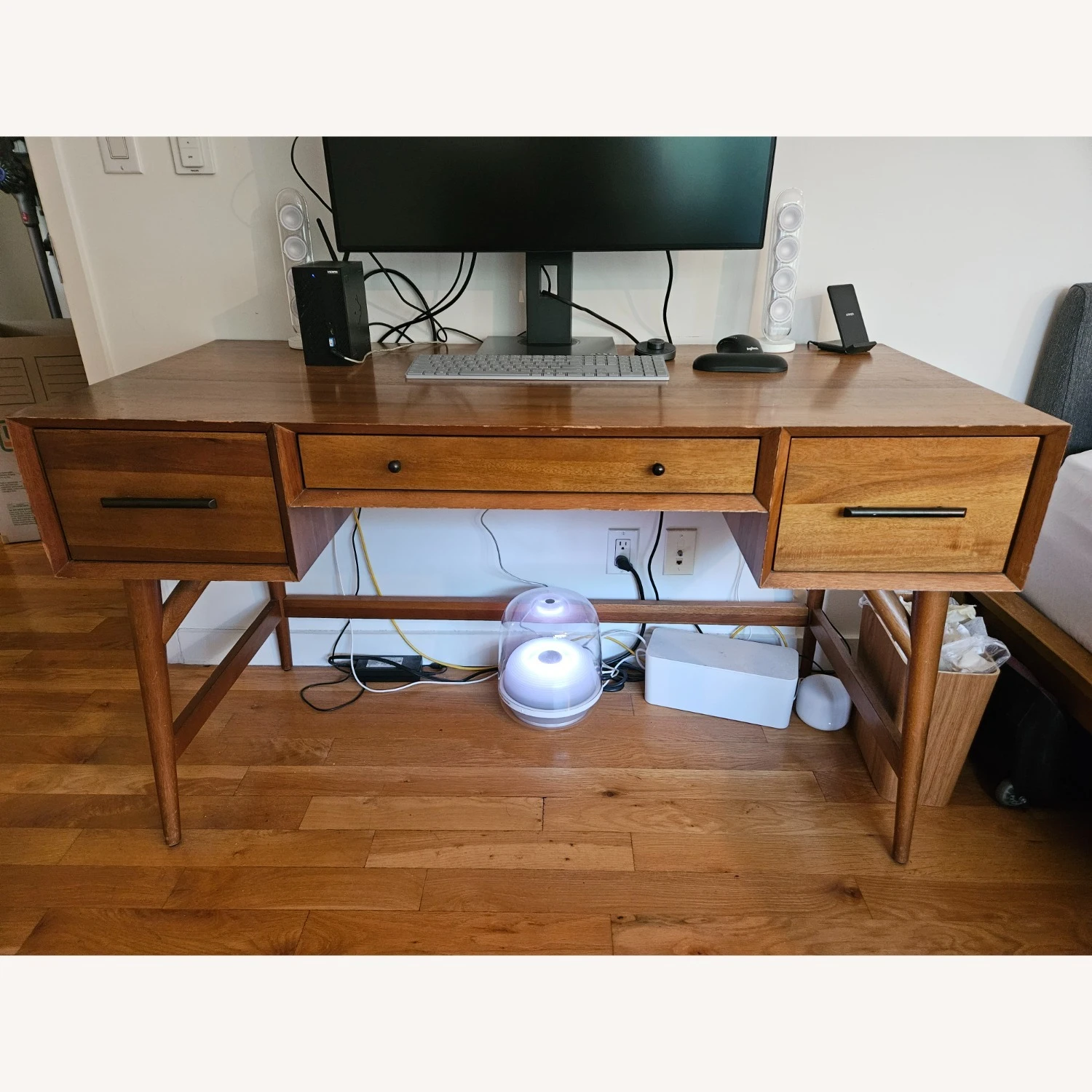 Seller’s Notes: Gently used West Elm Mid-Century Desk (52″) in Acorn. Pls see photos for some minor wear and tear and scratches – the whole desk is made out of real solid wood, so there is some fraying/splinters around some corners. But the imperfections are purely cosmetic, andthe desk is structurally sound (no wobbling) – very much useable for many more years.